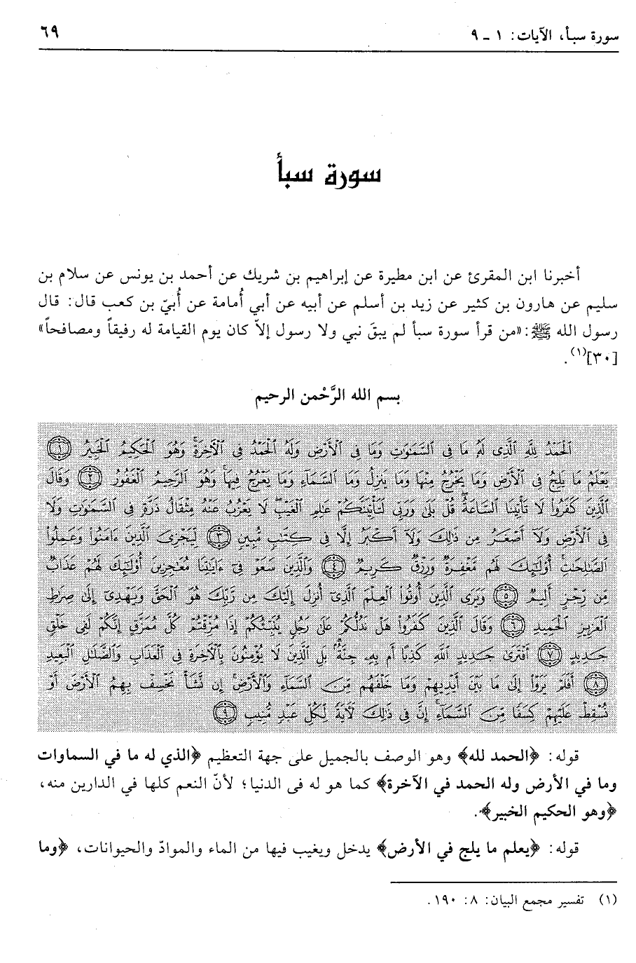 الْحَمْدُ لِلَّهِ الَّذِي لَهُ ما فِي السَّماواتِ وَما فِي الْأَرْضِ وَلَهُ الْحَمْدُ فِي الْآخِرَةِ وَهُوَ الْحَكِيمُ الْخَبِيرُ (1) يَعْلَمُ ما يَلِجُ فِي الْأَرْضِ وَما يَخْرُجُ مِنْها وَما يَنْزِلُ مِنَ السَّماءِ وَما يَعْرُجُ فِيها وَهُوَ الرَّحِيمُ الْغَفُورُ (2) وَقالَ الَّذِينَ كَفَرُوا لا تَأْتِينَا السَّاعَةُ قُلْ بَلى وَرَبِّي لَتَأْتِيَنَّكُمْ عالِمِ الْغَيْبِ لا يَعْزُبُ عَنْهُ مِثْقالُ ذَرَّةٍ فِي السَّماواتِ وَلا فِي الْأَرْضِ وَلا أَصْغَرُ مِنْ ذلِكَ وَلا أَكْبَرُ إِلاَّ فِي كِتابٍ مُبِينٍ (3) لِيَجْزِيَ الَّذِينَ آمَنُوا وَعَمِلُوا الصَّالِحاتِ أُولئِكَ لَهُمْ مَغْفِرَةٌ وَرِزْقٌ كَرِيمٌ (4)