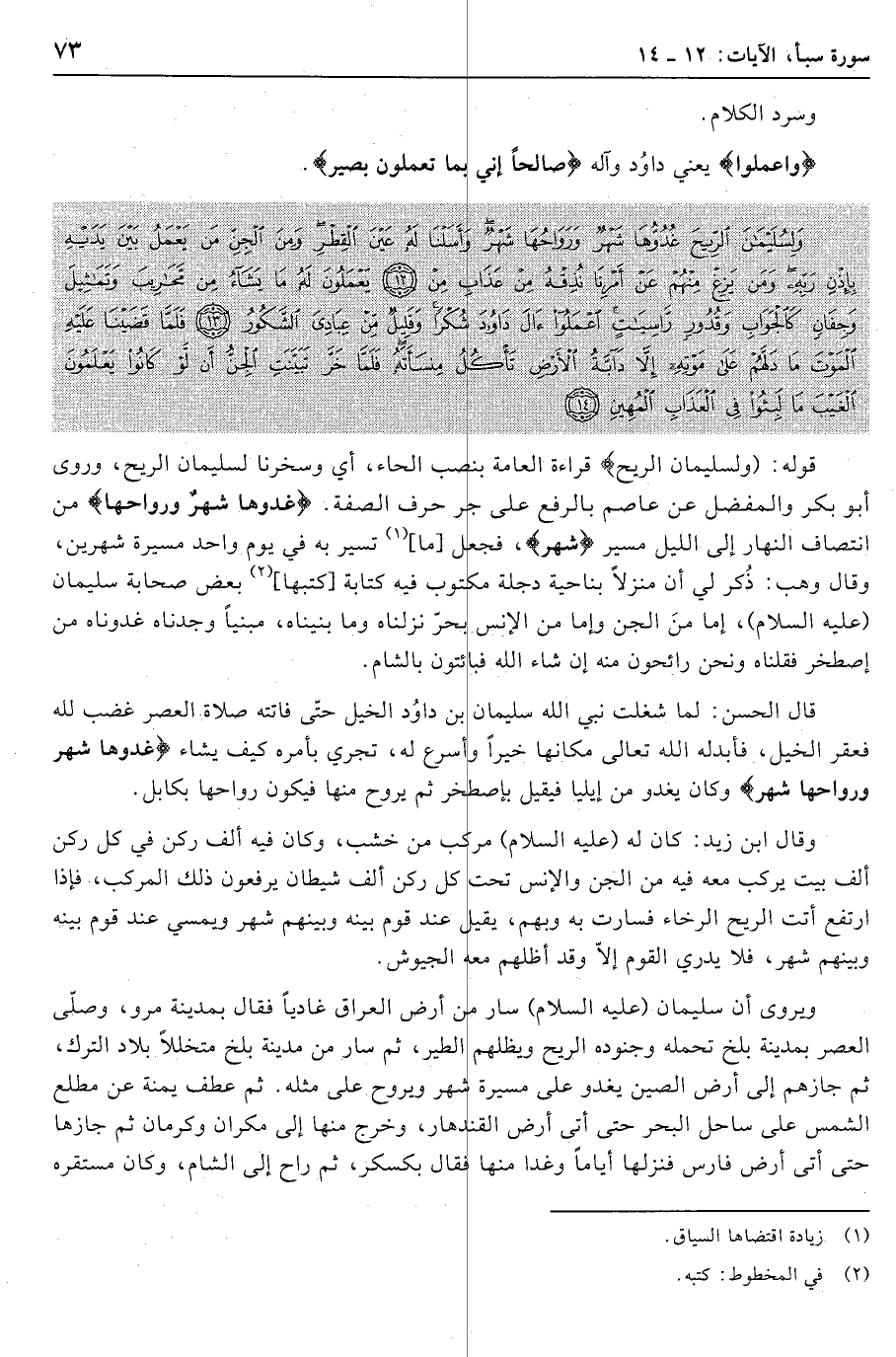 وَلِسُلَيْمانَ الرِّيحَ غُدُوُّها شَهْرٌ وَرَواحُها شَهْرٌ وَأَسَلْنا لَهُ عَيْنَ الْقِطْرِ وَمِنَ الْجِنِّ مَنْ يَعْمَلُ بَيْنَ يَدَيْهِ بِإِذْنِ رَبِّهِ وَمَنْ يَزِغْ مِنْهُمْ عَنْ أَمْرِنا نُذِقْهُ مِنْ عَذابِ السَّعِيرِ (12) يَعْمَلُونَ لَهُ ما يَشاءُ مِنْ مَحارِيبَ وَتَماثِيلَ وَجِفانٍ كَالْجَوابِ وَقُدُورٍ راسِياتٍ اعْمَلُوا آلَ داوُدَ شُكْراً وَقَلِيلٌ مِنْ عِبادِيَ الشَّكُورُ (13) فَلَمَّا قَضَيْنا عَلَيْهِ الْمَوْتَ ما دَلَّهُمْ عَلى مَوْتِهِ إِلاَّ دَابَّةُ الْأَرْضِ تَأْكُلُ مِنْسَأَتَهُ فَلَمَّا خَرَّ تَبَيَّنَتِ الْجِنُّ أَنْ لَوْ كانُوا يَعْلَمُونَ الْغَيْبَ ما لَبِثُوا فِي الْعَذابِ الْمُهِينِ (14)