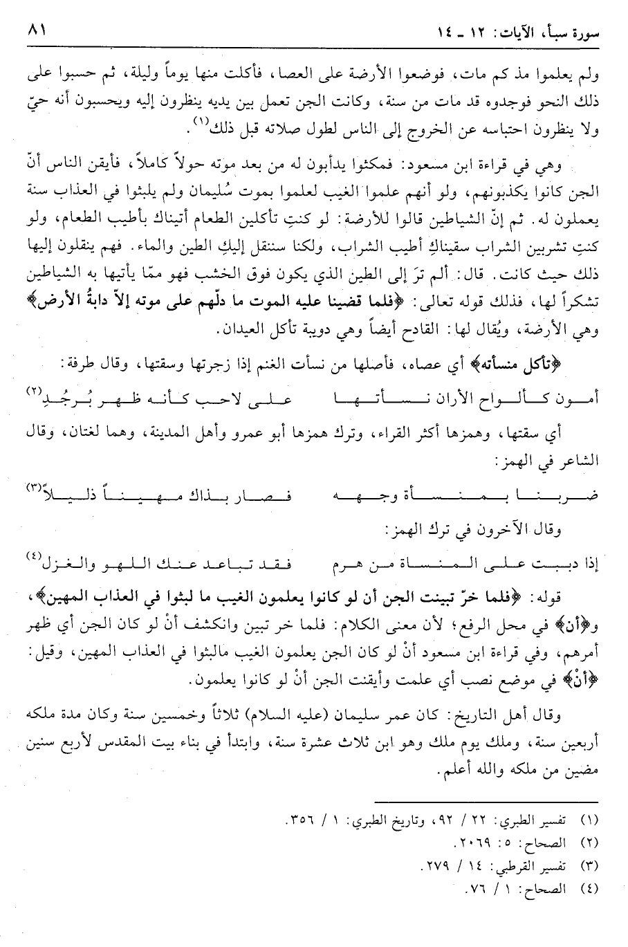 ولم يعلموا مذ كم مات، فوضعوا الأرضة على العصا، فأكلت منها يوما وليلة، ثم حسبوا على ذلك النحو فوجدوه قد مات من سنة، وكانت الجن تعمل بين يديه ينظرون إليه ويحسبون أنه حيّ ولا ينظرون احتباسه عن الخروج إلى الناس لطول صلاته قبل ذلك «1» .