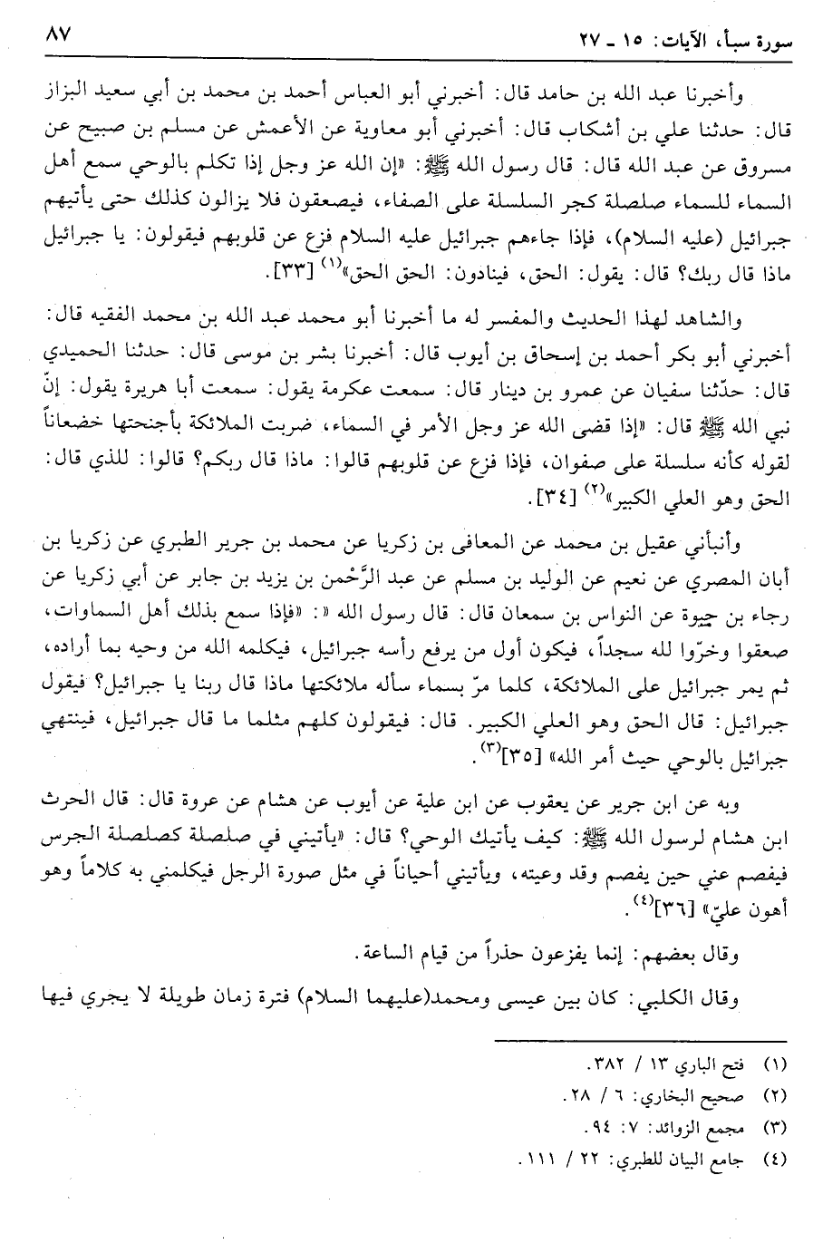 أخبرني أبو بكر أحمد بن إسحاق بن أيوب قال: أخبرنا بشر بن موسى قال: حدثنا الحميدي قال: حدّثنا سفيان عن عمرو بن دينار قال: سمعت عكرمة يقول: سمعت أبا هريرة يقول: إنّ نبي الله صلّى الله عليه وسلم قال: «إذا قضى الله عز وجل الأمر في السماء، ضربت الملائكة بأجنحتها خضعانا لقوله كأنه سلسلة على صفوان، فإذا فُزِّعَ عَنْ قُلُوبِهِمْ قالُوا: ماذا قالَ رَبُّكُمْ؟ قالُوا: للذي قال: