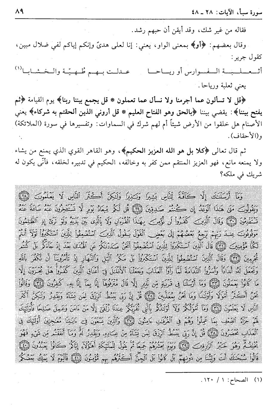 قُلْ لا تُسْئَلُونَ عَمَّا أَجْرَمْنا وَلا نُسْئَلُ عَمَّا تَعْمَلُونَ. قُلْ يَجْمَعُ بَيْنَنا رَبُّنا يوم القيامة ثُمَّ يَفْتَحُ بَيْنَنا: يقضي بيننا بِالْحَقِّ وَهُوَ الْفَتَّاحُ الْعَلِيمُ. قُلْ أَرُونِيَ الَّذِينَ أَلْحَقْتُمْ بِهِ شُرَكاءَ يعني الأصنام هل خلقوا من الأرض شيئا أم لهم شرك في السماوات: وتفسيرها في سورة (الملائكة) و (الأحقاف) .