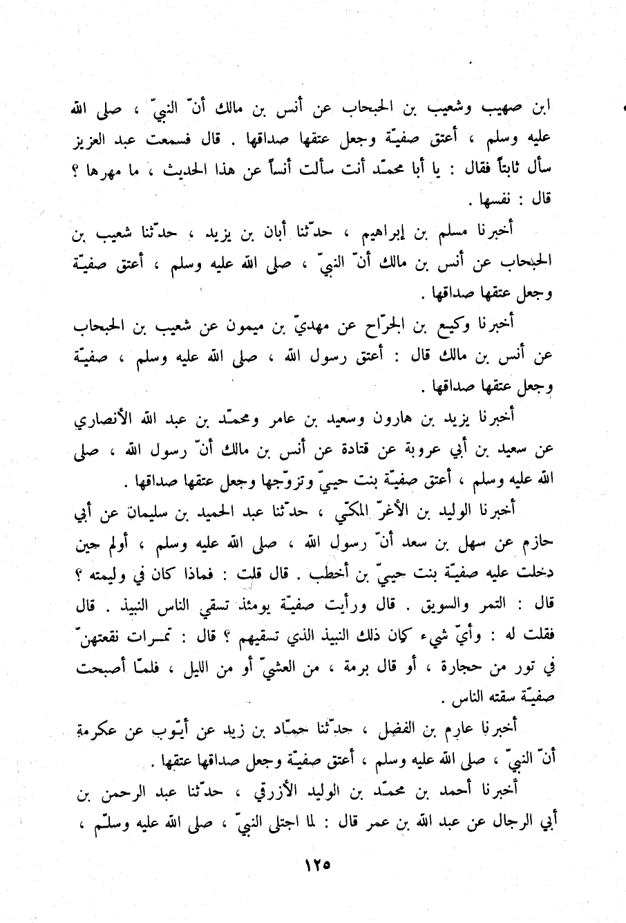أَخْبَرَنَا وَكِيعُ بْنُ الْجَرَّاحِ، عَنْ مَهْدِيِّ بْنِ مَيْمُونٍ، عَنْ شُعَيْبِ بْنِ الْحَبْحَابِ، عَنْ أَنَسِ بْنِ مَالِكٍ قَالَ: «§أَعْتَقَ رَسُولُ اللَّهِ صلّى الله عليه وسلم صَفِيَّةَ وَجَعَلَ عِتْقَهَا صَدَاقَهَا» .