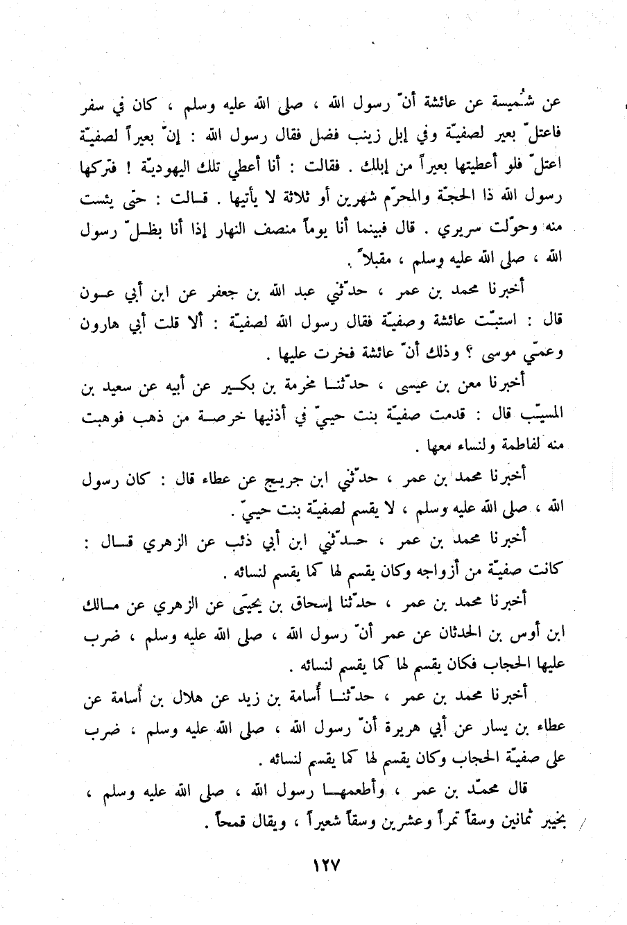 أَخْبَرَنَا مُحَمَّدُ بْنُ عُمَرَ، حَدَّثَنَا أُسَامَةُ بْنُ زَيْدٍ، عَنْ هِلَالِ بْنِ أُسَامَةَ، عَنْ عَطَاءِ بْنِ يَسَارٍ، عَنْ أَبِي هُرَيْرَةَ، §أَنَّ رَسُولَ اللَّهِ صلّى الله عليه وسلم ضَرَبَ عَلَى صَفِيَّةَ الْحِجَابَ وَكَانَ يَقْسِمُ لَهَا كَمَا يَقْسِمُ لِنِسَائِهِ. قَالَ مُحَمَّدُ بْنُ عُمَرَ: وَأَطْعَمَهَا رَسُولُ اللَّهِ صلّى الله عليه وسلم بِخَيْبَرَ ثَمَانِينَ وَسْقًا تَمْرًا وَعِشْرِينَ وَسْقًا شَعِيرًا، وَيُقَالُ قَمْحًا.