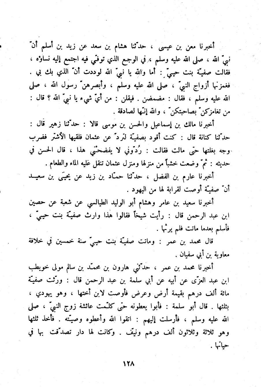 أَخْبَرَنَا مُحَمَّدُ بْنُ عُمَرَ، حَدَّثَنِي هَارُونُ بْنُ مُحَمَّدِ بْنِ سَالِمٍ، مَوْلَى خُوَيْطِبِ بْنِ عَبْدِ الْعُزَّى عَنْ أَبِيهِ، عَنْ أَبِي سَلَمَةَ بْنِ عَبْدِ الرَّحْمَنِ قَالَ: " §وَرِثَتْ صَفِيَّةُ مِائَةَ أَلْفِ دِرْهَمٍ بِقِيمَةِ أَرْضٍ وَعَرَضٍ، فَأَوْصَتْ لِابْنِ أُخْتِهَا وَهُوَ يَهُودِيٌّ بِثُلَثِهَا، قَالَ أَبُو سَلَمَةَ: فَأَبَوْا يُعْطَوْنَهُ حَتَّى كَلَّمَتْ عَائِشَةَ زَوْجَ النَّبِيِّ صلّى الله عليه وسلم، فَأَرْسَلَتْ إِلَيْهِمُ: اتَّقُوا اللَّهَ وَأَعْطُوهُ وَصِيَّتَهُ فَأَخَذَ ثُلُثَهَا وَهُوَ ثَلَاثَةٌ وَثَلَاثُونَ أَلْفَ دِرْهَمٍ وَنَيِّفٌ وَكَانَتْ لَهَا دَارٌ تَصَدَّقَتْ بِهَا فِي حَيَاتِهَا ".