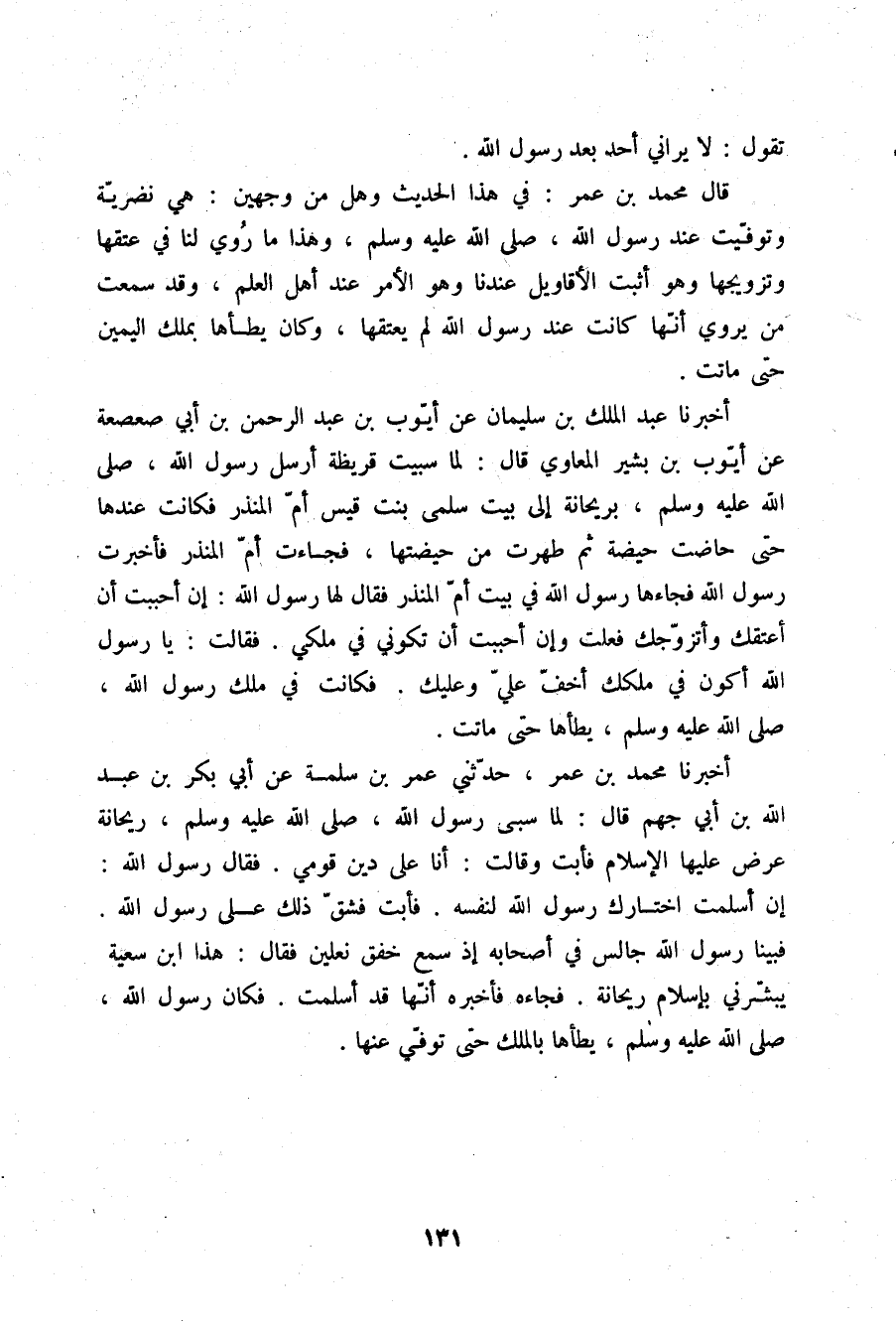 أَخْبَرَنَا مُحَمَّدُ بْنُ عُمَرَ، حَدَّثَنِي عُمَرُ بْنُ سَلَمَةَ، عَنْ أَبِي بَكْرِ بْنِ عَبْدِ اللَّهِ بْنِ أَبِي جَهْمٍ قَالَ: " لَمَّا سَبَى رَسُولُ اللَّهِ صلّى الله عليه وسلم رَيْحَانَةَ عَرَضَ عَلَيْهَا الْإِسْلَامَ فَأَبَتْ وَقَالَتْ: أَنَا عَلَى دِينِ قَوْمِي، فَقَالَ رَسُولُ اللَّهِ: «§إِنْ أَسْلَمْتِ اخْتَارَكِ رَسُولُ اللَّهِ لِنَفْسِهِ» . فَأَبَتْ فَشَقَّ ذَلِكَ عَلَى رَسُولِ اللَّهِ فَبَيْنَا رَسُولُ اللَّهِ جَالِسٌ فِي أَصْحَابِهِ إِذْ سَمِعَ خَفْقَ نَعْلَيْنِ، فَقَالَ: «هَذَا ابْنُ سَعْيَةَ يُبَشِّرُنِي بِإِسْلَامِ رَيْحَانَةَ» فَجَاءَهُ فَأَخْبَرَهُ أَنَّهَا قَدْ أَسْلَمَتْ، فَكَانَ رَسُولُ اللَّهِ صلّى الله عليه وسلم يَطَؤُهَا بِالْمِلْكِ حَتَّى تُوُفِّيَ عَنْهَا.