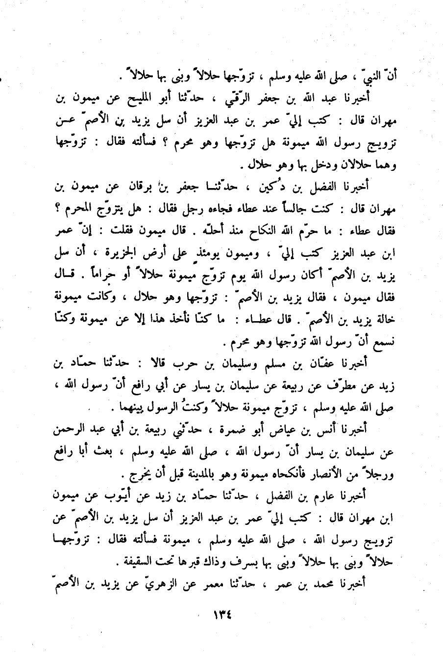 أَخْبَرَنَا عَبْدُ اللَّهِ بْنُ جَعْفَرٍ الرَّقِّيُّ، حَدَّثَنَا أَبُو الْمَلِيحِ، عَنْ مَيْمُونِ بْنِ مِهْرَانَ قَالَ: " كَتَبَ إِلَيَّ عُمَرُ بْنُ عَبْدِ الْعَزِيزِ أَنْ سَلْ يَزِيدَ بْنِ الْأَصَمِّ عَنْ تَزْوِيجِ رَسُولِ اللَّهِ مَيْمُونَةَ هَلْ تَزَوَّجَهَا وَهُوَ مُحْرِمٌ؟ فَسَأَلْتُهُ، فَقَالَ: §تَزَوَّجَهَا وَهُمَا حَلَالَانِ وَدَخَلَ بِهَا وَهُوَ حَلَالٌ ".