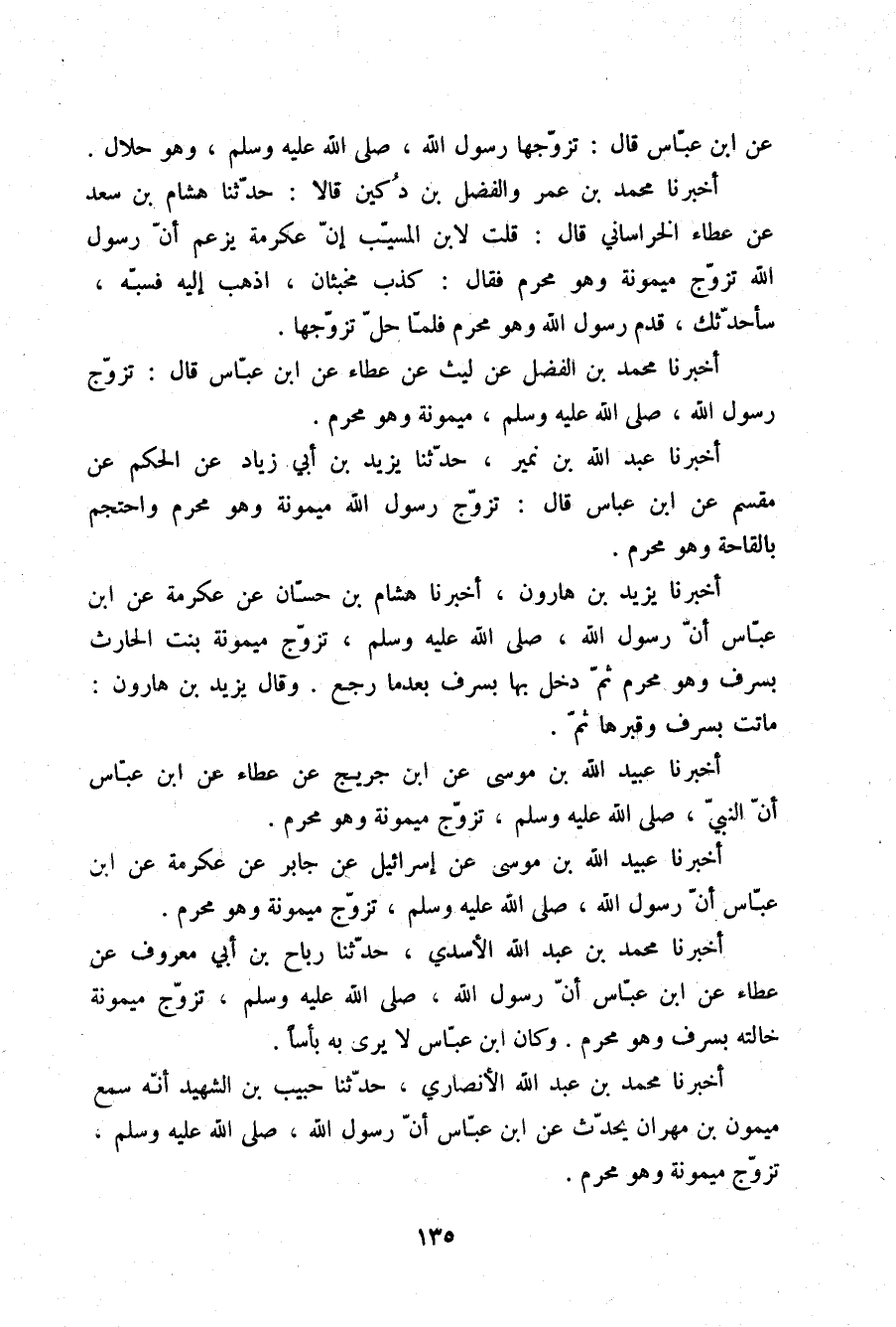 أَخْبَرَنَا مُحَمَّدُ بْنُ الْفَضْلِ، عَنْ لَيْثٍ، عَنْ عَطَاءٍ، عَنِ ابْنِ عَبَّاسٍ قَالَ: «§تَزَوَّجَ رَسُولُ اللَّهِ صلّى الله عليه وسلم مَيْمُونَةَ وَهُوَ مُحْرِمٌ» .