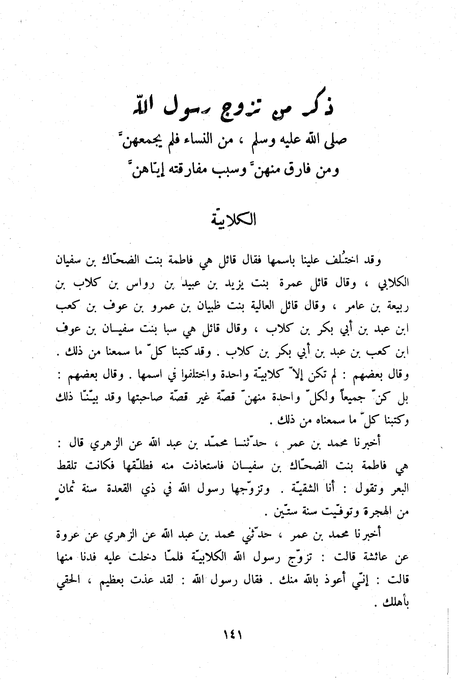 §الْكِلَابِيَّةُ وَقَدِ اخْتُلِفَ عَلَيْنَا بِاسْمِهَا، فَقَالَ قَائِلٌ: هِيَ فَاطِمَةُ بِنْتُ الضَّحَّاكِ بْنِ سُفْيَانَ الْكِلَابِيُّ وَقَالَ قَائِلٌ: عَمْرَةُ بِنْتُ يَزِيدَ بْنِ عُبَيْدِ بْنِ رُوَاسِ بْنِ كِلَابِ بْنِ رَبِيعَةَ بْنِ عَامِرٍ، وَقَالَ قَائِلٌ: الْعَالِيَةُ بِنْتُ ظَبْيَانَ بْنَ عَمْرِو بْنِ عَوْفِ بْنِ كَعْبِ بْنِ عَبْدِ بْنِ أَبِي بَكْرِ بْنِ كِلَابٍ، وَقَالَ قَائِلٌ: هِيَ سَبَّا بِنْتَ سُفْيَانَ بْنِ عَوْفِ بْنِ كَعْبِ بْنِ عَبْدِ بْنِ أَبِي بَكْرِ بْنِ كِلَابٍ، وَقَدْ كَتَبْنَا كُلَّ مَا سَمِعْنَا مِنْ ذَلِكَ، وَقَالَ بَعْضُهُمْ: لَمْ تَكُنْ إِلَّا كِلَابِيَّةٌ وَاحِدَةٌ، وَاخْتَلَفُوا فِي اسْمِهَا، وَقَالَ بَعْضُهُمْ: بَلْ كُنَّ جَمِيعًا وَلِكُلِّ وَاحِدَةٍ مِنْهُنَّ قِصَّةٌ غَيْرُ قِصَّةِ صَاحِبَتِهَا وَقَدْ بَيَّنَّا ذَلِكَ وَكَتَبْنَا كُلَّ مَا سَمِعْنَاهُ مِنْ ذَلِكَ أَخْبَرَنَا مُحَمَّدُ بْنُ عُمَرَ، حَدَّثَنَا مُحَمَّدُ بْنُ عَبْدِ اللَّهِ، عَنِ الزُّهْرِيِّ قَالَ: هِيَ فَاطِمَةُ بِنْتُ الضَّحَّاكِ بْنِ سُفْيَانَ فَاسْتَعَاذَتْ مِنْهُ فَطَلَّقَهَا فَكَانَتْ تَلْقَطُ الْبَعْرَ وَتَقُولُ أَنَا الشَّقِيَّةُ وَتَزَوَّجَهَا رَسُولُ اللَّهِ فِي ذِي الْقَعْدَةِ سَنَةَ ثَمَانٍ مِنَ الْهِجْرَةِ وَتُوُفِّيَتْ سَنَةَ سِتِّينَ