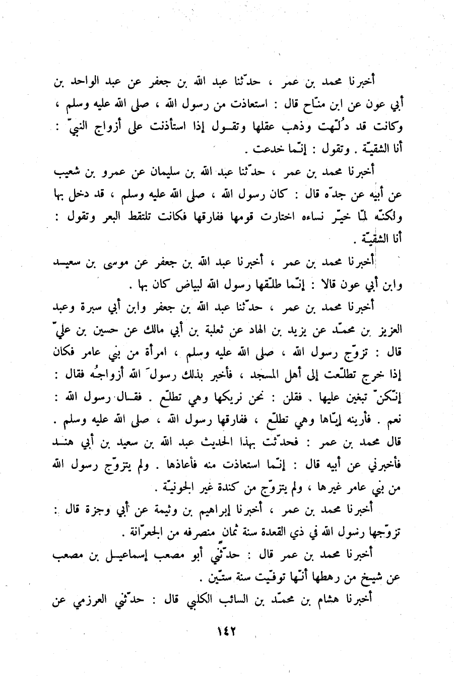 أَخْبَرَنَا مُحَمَّدُ بْنُ عُمَرَ، حَدَّثَنَا عَبْدُ اللَّهِ بْنُ جَعْفَرٍ، وَابْنُ أَبِي سَبْرَةَ، وَعَبْدُ الْعَزِيزِ بْنُ مُحَمَّدٍ، عَنْ يَزِيدَ بْنِ الْهَادِ، عَنْ ثَعْلَبَةَ بْنِ أَبِي مَالِكٍ، عَنْ حُسَيْنِ، عْنِ عَلِيٍّ قَالَ: تَزَوَّجَ رَسُولُ اللَّهِ صلّى الله عليه وسلم امْرَأَةً مِنْ بَنِي عَامِرٍ فَكَانَ إِذَا خَرَجَ تَطَلَّعَتْ إِلَى أَهْلِ الْمَسْجِدِ فَأَخْبَرَ بِذَلِكَ رَسُولَ اللَّهِ أَزْوَاجُهُ، فَقَالَ: «§إِنَّكُنَّ تَبْغَيْنَ عَلَيْهَا» فَقُلْنَ: نَحْنُ نُرِيكَهَا وَهِيَ تَطَّلِعُ، فَقَالَ رَسُولُ اللَّهِ: «نَعَمْ» فَأَرَيْنَهُ إِيَّاهَا وَهِيَ تَطَّلِعُ فَفَارَقَهَا رَسُولُ اللَّهِ صلّى الله عليه وسلم قَالَ مُحَمَّدُ بْنُ عُمَرَ: فَحَدَّثْتُ بِهَذَا الْحَدِيثِ عَبْدَ اللَّهِ بْنَ سَعِيدِ بْنِ أَبِي هِنْدٍ فَأَخْبَرَنِي عَنْ أَبِيهِ قَالَ: إِنَّمَا اسْتَعَاذَتْ مِنْهُ فَأَعَاذَهَا وَلَمْ يَتَزَوَّجْ رَسُولُ اللَّهِ مِنْ بَنِي عَامِرٍ غَيْرَهَا وَلَمْ يَتَزَوَّجْ مِنْ كِنْدَةَ غَيْرَ الْجُونِيَّةِ أَخْبَرَنَا مُحَمَّدُ بْنُ عُمَرَ، أَخْبَرَنَا إِبْرَاهِيمُ بْنُ وَثِيمَةَ، عَنْ أَبِي وَجْزَةَ قَالَ: تَزَوَّجَهَا رَسُولُ اللَّهِ فِي ذِي الْقَعْدَةِ سَنَةَ ثَمَانٍ مُنْصَرَفَهُ مِنَ الْجِعْرَانَةِ أَخْبَرَنَا مُحَمَّدُ بْنُ عُمَرَ قَالَ: حَدَّثَنِي أَبُو مُصْعَبٍ إِسْمَاعِيلُ بْنُ مُصْعَبٍ عَنْ شَيْخٍ مِنْ رَهْطِهَا أَنَّهَا تُوُفِّيَتْ سَنَةَ سِتِّينَ