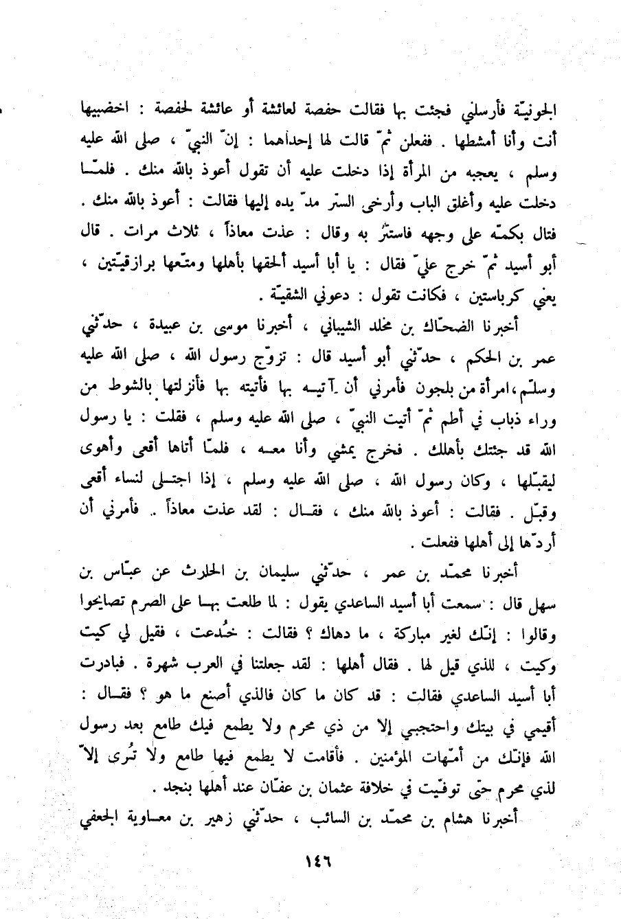 أَخْبَرَنَا الضَّحَّاكُ بْنُ مَخْلَدٍ الشَّيْبَانِيُّ، أَخْبَرَنَا مُوسَى بْنُ عُبَيْدَةَ، حَدَّثَنِي عُمَرُ بْنُ الْحَكَمِ، حَدَّثَنِي أَبُو أُسَيْدٍ قَالَ: تَزَوَّجَ رَسُولُ اللَّهِ صلّى الله عليه وسلم امْرَأَةً مِنْ بَلْجُونٍ فَأَمَرَنِي أَنْ آتِيَهُ بِهَا فَأَتَيْتُهُ بِهَا فَأَنْزَلْتُهَا بِالشَّوْطِ مِنْ وَرَاءِ ذُبَابٍ فِي أُطُمٍ ثُمَّ أَتَيْتُ النَّبِيَّ صلّى الله عليه وسلم فَقُلْتُ: يَا رَسُولَ اللَّهِ قَدْ جِئْتُكَ بِأَهْلِكَ، فَخَرَجَ يَمْشِي وَأَنَا مَعَهُ فَلَمَّا أَتَاهَا أَقْعَى وَأَهْوَى لِيُقَبِّلَهَا وَكَانَ رَسُولُ اللَّهِ صلّى الله عليه وسلم إِذَا اجْتَلَى النِّسَاءَ أَقْعَى وَقَبَّلَ، فَقَالَتْ: أَعُوذُ بِاللَّهِ مِنْكَ، فَقَالَ: «§لَقَدْ عُذْتِ مُعَاذًا» . فَأَمَرَنِي أَنْ أَرُدَّهَا إِلَى أَهْلِهَا فَفَعَلْتُ أَخْبَرَنَا مُحَمَّدُ بْنُ عُمَرَ، حَدَّثَنِي سُلَيْمَانُ بْنُ الْحَارِثِ، عَنْ عَبَّاسِ بْنِ سَهْلٍ، قَالَ: سَمِعْتُ أَبَا أُسَيْدٍ السَّاعِدِيَّ يَقُولُ: لَمَّا طَلَعْتُ بِهَا عَلَى الصِّرْمِ تَصَايَحُوا وَقَالُوا: إِنَّكِ لَغَيْرُ مُبَارَكَةٍ مَا دَهَاكِ، فَقَالَتْ: خُدِعْتُ فَقِيلَ لِي كَيْتُ وَكَيْتُ لِلَّذِي قِيلَ لَهَا، فَقَالَ أَهْلُهَا: لَقَدْ جَعَلْتَنَا فِي الْعَرَبِ شُهْرَةً، فَبَادَرَتْ أَبَا أُسَيْدٍ السَّاعِدِيَّ فَقَالَتْ: قَدْ كَانَ مَا كَانَ فَالَّذِي أَصْنَعُ مَا هُوَ؟ فَقَالَ: أَقِيمِي فِي بَيْتِكِ وَاحْتَجِبِي إِلَّا مِنْ ذِي مَحْرَمٍ وَلَا يَطْمَعُ فِيكِ طَامِعٌ بَعْدَ رَسُولِ اللَّهِ فَإِنَّكِ مِنْ أُمَّهَاتِ الْمُؤْمِنِينَ، فَأَقَامَتْ لَا يَطْمَعُ فِيهَا طَامِعٌ وَلَا تُرَى إِلَّا لِذِي مَحْرَمٍ حَتَّى تُوُفِّيَتْ فِي خِلَافَةِ عُثْمَانَ بْنِ عَفَّانَ عِنْدَ أَهْلِهَا بِنَجْدٍ أَخْبَرَنَا هِشَامُ بْنُ مُحَمَّدِ بْنِ السَّائِبِ، حَدَّثَنِي زُهَيْرُ بْنُ مُعَاوِيَةَ الْجُعْفِيُّ -[147]-، أَنَّهَا مَاتَتْ كَمَدًا