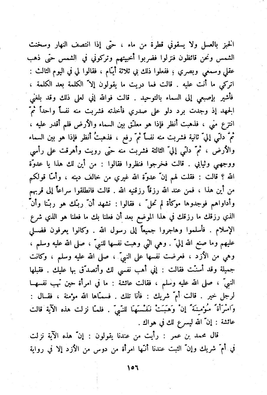 الْخُبْزَ بِالْعَسَلِ وَلَا يَسْقُونِي قَطْرَةً مِنْ مَاءٍ حَتَّى إِذَا انْتَصَفَ النَّهَارُ وَسَخِنَتِ الشَّمْسُ وَنَحْنُ قَائِظُونَ فَنَزَلُوا فَضَرَبُوا أَخْبِيَتَهُمْ وَتَرَكُونِي فِي الشَّمْسِ حَتَّى ذَهَبَ عَقْلِي وَسَمْعِي وَبَصَرِي، فَفَعَلُوا ذَلِكَ بِي ثَلَاثَةَ أَيَّامٍ فَقَالُوا لِي فِي الْيَوْمِ الثَّالِثِ: اتْرُكِي مَا أَنْتِ عَلَيْهِ، قَالَتْ: فَمَا دَرَيْتُ مَا يَقُولُونَ إِلَّا الْكَلِمَةَ بَعْدَ الْكَلِمَةِ فَأُشِيرُ بِإِصْبَعِي إِلَى السَّمَاءِ بِالتَّوْحِيدِ، قَالَتْ: فَوَاللَّهِ إِنِّي لَعَلَى ذَلِكَ وَقَدْ بَلَغَنِي الْجَهْدُ إِذْ وَجَدْتُ بَرْدَ دَلْو عَلَى صَدْرِي فَأَخَذْتُهُ فَشَرِبْتُ مِنْهُ نَفَسًا وَاحِدًا ثُمَّ انْتُزِعَ مِنِّي فَذَهَبْتُ أَنْظُرُ فَإِذَا هُوَ مُعَلَّقٌ بَيْنَ السَّمَاءِ وَالْأَرْضِ فَلَمْ أَقْدِرْ عَلَيْهِ ثُمَّ دُلِّيَ إِلَيَّ ثَانِيَةً فَشَرِبْتُ مِنْهُ نَفَسًا ثُمَّ رُفِعَ فَذَهَبْتُ أَنْظُرُ فَإِذَا هُوَ بَيْنَ السَّمَاءِ وَالْأَرْضِ ثُمَّ دُلِّيَ إِلَيَّ الثَّالِثَةَ فَشَرِبْتُ مِنْهُ حَتَّى رُوِّيتُ وَأَهْرَقْتُ عَلَى رَأْسِي وَوَجْهِي وَثِيَابِي، قَالَتْ: فَخَرَجُوا فَنَظَرُوا فَقَالُوا: مِنْ أَيْنَ لَكِ هَذَا يَا عَدُوَّةَ اللَّهِ؟، قَالَتْ: فَقُلْتُ لَهُمْ إِنَّ عَدُوَّ اللَّهِ غَيْرِي مَنْ خَالَفَ دِينَهُ، وَأَمَّا قَوْلُكُمْ مِنْ أَيْنَ هَذَا فَمِنْ عِنْدِ اللَّهِ رِزْقًا رَزَقَنِيهِ اللَّهُ، قَالَتْ: فَانْطَلَقُوا سِرَاعًا إِلَى قِرَبِهِمْ وَأَدْوَاهُمْ فَوَجَدُوهَا مُوكَأَةً لَمْ تُحَلَّ فَقَالُوا: نَشْهَدُ أَنَّ رَبَّكِ هُوَ رَبُّنَا وَأَنَّ الَّذِي رَزَقَكِ مَا رَزَقَكِ فِي هَذَا الْمَوْضِعِ بَعْدَ أَنْ فَعَلْنَا بِكِ مَا فَعَلْنَا هُوَ الَّذِي شَرَعَ الْإِسْلَامَ فَأَسْلَمُوا وَهَاجَرُوا جَمِيعًا إِلَى رَسُولِ اللَّهِ وَكَانُوا يَعْرِفُونَ فَضْلِي عَلَيْهِمْ وَمَا صَنَعَ اللَّهُ إِلَيَّ وَهِيَ الَّتِي وَهَبَتْ نَفْسَهَا لِلنَّبِيِّ صلّى الله عليه وسلم وَهِيَ مِنَ الْأَزْدِ، فَعَرَضَتْ نَفْسَهَا عَلَى النَّبِيِّ صلّى الله عليه وسلم وَكَانَتْ جَمِيلَةً، وَقَدْ أَسَنَّتْ فَقَالَتْ: إِنِّي أَهَبُ نَفْسِي لَكِ وَأَتَصَدَّقُ بِهَا عَلَيْكَ فَقَبِلَهَا النَّبِيُّ صلّى الله عليه وسلم فَقَالَتْ عَائِشَةُ: مَا فِي امْرَأَةٍ حِينَ تَهَبُ نَفْسَهَا لِرَجُلٍ خَيْرٌ، قَالَتْ أُمُّ شَرِيكٍ: فَأَنَا تِلْكَ فَسَمَّاهَا اللَّهُ مُؤْمِنَةً، فَقَالَ: {وَامْرَأَةً مُؤْمِنَةً إِنْ وَهَبَتْ نَفْسَهَا لِلنَّبِيِّ} [الأحزاب: 50] فَلَمَّا نَزَلَتْ هَذِهِ الْآيَةُ، قَالَتْ عَائِشَةُ: إِنَّ اللَّهَ لَيُسْرِعُ لَكِ فِي هَوَاكِ " قَالَ مُحَمَّدُ بْنُ عُمَرَ: رَأَيْتُ مَنْ عِنْدَنَا يَقُولُونَ: إِنَّ هَذِهِ الْآيَةَ نَزَلَتْ فِي أُمِّ شَرِيكٍ وَإِنَّ الثَّبْتَ عِنْدَنَا أَنَّهَا امْرَأَةٌ مِنْ دَوْسٍ مِنَ الْأَزْدِ إِلَّا فِي رِوَايَةِ
