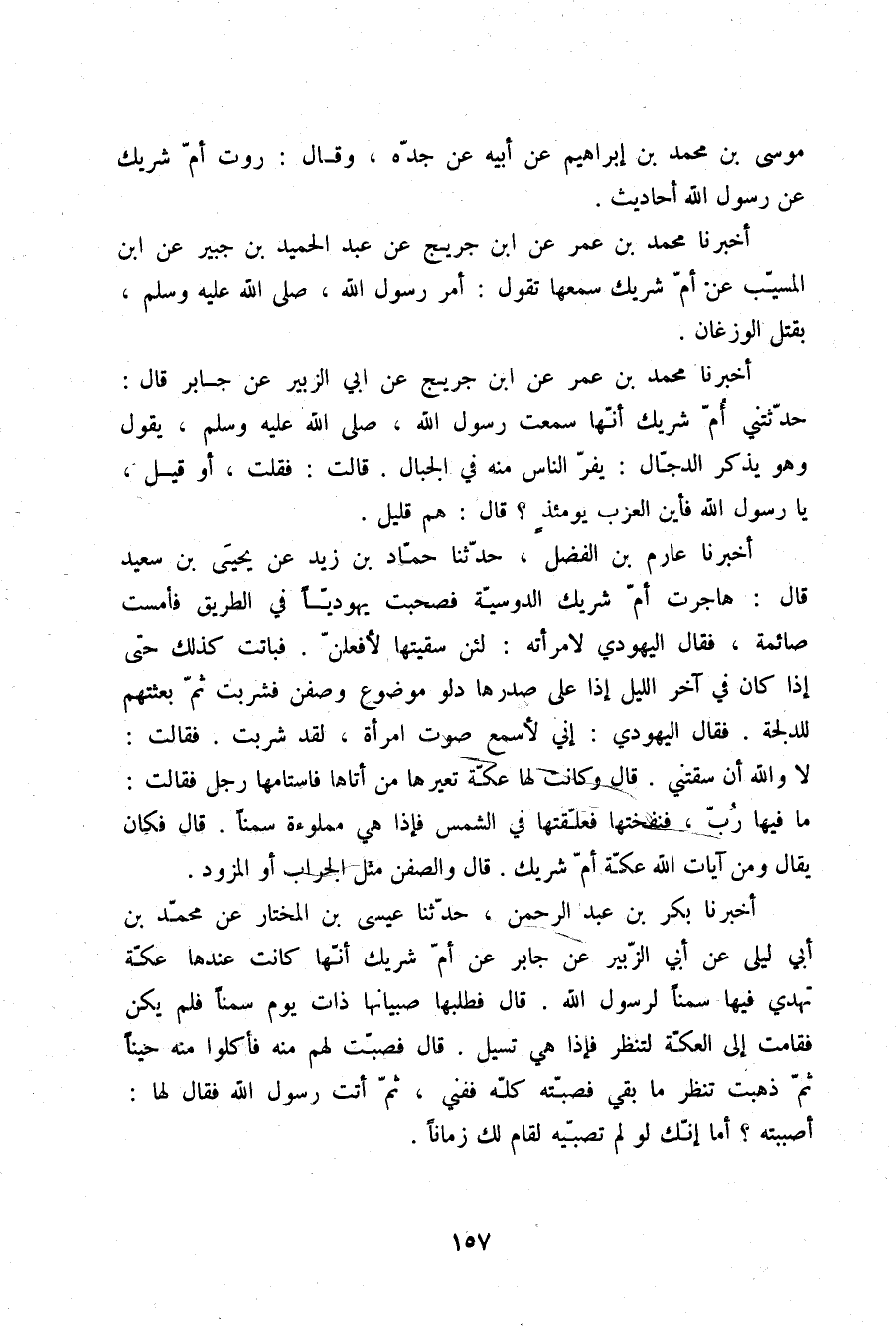 أَخْبَرَنَا مُحَمَّدُ بْنُ عُمَرَ، عَنِ ابْنِ جُرَيْجٍ، عَنْ أَبِي الزُّبَيْرِ، عَنْ جَابِرٍ، قَالَ: حَدَّثَتْنِي أُمُّ شَرِيكٍ، أَنَّهَا سَمِعَتْ رَسُولَ اللَّهِ صلّى الله عليه وسلم يَقُولُ وَهُوَ يَذْكُرُ الدَّجَّالَ: «§يَفِرُّ النَّاسُ مِنْهُ فِي الْجِبَالِ» ، قَالَتْ: فَقُلْتُ، أَوْ قِيلَ: يَا رَسُولَ اللَّهِ فَأَيْنَ الْعَرَبُ يَوْمَئِذٍ؟، قَالَ: «هُمْ قَلِيلٌ» ، أَخْبَرَنَا عَارِمُ بْنُ الْفَضْلِ، حَدَّثَنَا حَمَّادُ بْنُ زَيْدٍ عَنْ يَحْيَى بْنِ سَعِيدٍ قَالَ: " هَاجَرَتْ أُمُّ شَرِيكٍ الدَّوْسِيَّةُ فَصَحِبَتْ يَهُودِيًّا فِي الطَّرِيقِ فَأَمْسَتْ صَائِمَةً، فَقَالَ الْيَهُودِيُّ لِامْرَأَتِهِ: لَئِنْ سَقَيْتِهَا لَأَفْعَلَنَّ، فَبَاتَتْ كَذَلِكَ حَتَّى إِذَا كَانَ فِي آخِرِ اللَّيْلِ إِذَا هُوَ عَلَى صَدْرِهَا دَلْوٌ مَوْضُوعٌ وَصُفْنٌ فَشَرِبَتْ ثُمَّ بَعَثَتْهُمْ لِلدُّلْجَةِ، فَقَالَ الْيَهُودِيُّ: إِنِّي لَأَسْمَعُ صَوْتَ امْرَأَةٍ لَقَدْ شَرِبَتْ، فَقَالَتْ: لَا وَاللَّهِ أَنْ سَقَتْنِي، قَالَ: وَكَانَتْ لَهَا عُكَّةٌ تُعِيرُهَا مَنْ أَتَاهَا فَاسْتَامَهَا رَجُلٌ، فَقَالَتْ: مَا فِيهَا رُبٌّ، فَنَفَخَتْهَا فَعَلَّقَتْهَا فِي الشَّمْسِ فَإِذَا هِيَ مَمْلُوءَةٌ سَمْنًا، قَالَ: فَكَانَ يُقَالُ: وَمِنْ آيَاتِ اللَّهِ عُكَّةُ أُمِّ شَرِيكٍ، قَالَ: وَالصُّفْنُ مِثْلُ الْجِرَابِ أَوِ الْمِزْوَدِ