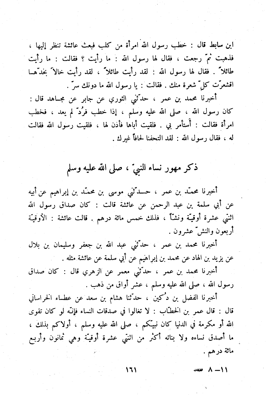 أَخْبَرَنَا مُحَمَّدُ بْنُ عُمَرَ، حَدَّثَنِي مَعْمَرٌ، عَنِ الزُّهْرِيِّ قَالَ: «§كَانَ صَدَاقُ رَسُولِ اللَّهِ صلّى الله عليه وسلم عَشَرَ أَوَاقٍ مِنْ ذَهَبٍ» .