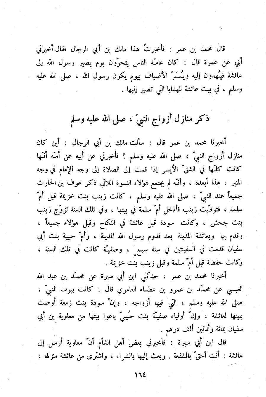 §ذِكْرُ مَنَازِلِ أَزْوَاجِ النَّبِيِّ صلّى الله عليه وسلم أَخْبَرَنَا مُحَمَّدُ بْنُ عُمَرَ قَالَ: سَأَلْتُ مَالِكَ بْنَ أَبِي الرِّجَالِ أَيْنَ كَانَ مَنَازِلُ أَزْوَاجِ النَّبِيِّ صلّى الله عليه وسلم؟ , فَأَخْبَرَنِي عَنْ أَبِيهِ عَنْ أُمِّهِ أَنَّهَا كَانَتْ كُلُّهَا فِي الشِّقِّ الْأَيْسَرِ إِذَا قُمْتَ إِلَى الصَّلَاةِ إِلَى وَجْهِ الْإِمَامِ فِي وَجْهِ الْمِنْبَرِ , هَذَا أَبْعَدُهُ , وَأَنَّهُ لَمْ يَجْتَمِعْ هَؤُلَاءِ النِّسْوَةِ اللَّاتِي ذَكَرَ عَوْفُ بْنُ الْحَارِثِ جَمِيعًا عِنْدَ النَّبِيِّ صلّى الله عليه وسلم , كَانَتْ زَيْنَبُ بِنْتُ خُزَيْمَةَ قَبْلَ أُمِّ سَلَمَةَ فَتُوُفِّيَتْ زَيْنَبُ فَأَدْخَلَ أُمَّ سَلَمَةَ فِي بَيْتِهَا وَفِي تِلْكَ السَّنَةِ تَزَوَّجَ زَيْنَبَ بِنْتَ جَحْشٍ , وَكَانَتْ سَوْدَةُ قَبْلَ عَائِشَةَ فِي النِّكَاحِ وَقَبْلَ هَؤُلَاءِ جَمِيعًا وَقَدِمَ بِهَا وَبِعَائِشَةَ الْمَدِينَةَ بَعْدَ قَدُومِ رَسُولِ اللَّهِ الْمَدِينَةَ وَأُمُّ حَبِيبَةَ بِنْتُ أَبِي سُفْيَانَ قَدِمَتْ فِي السَّفِينَتَيْنِ فِي سَنَةِ سَبْعٍ وَصَفِيَّةُ كَانَتْ فِي تِلْكَ السَّنَةِ وَكَانَتْ حَفْصَةُ قَبْلَ أُمِّ سَلَمَةَ وَقَبْلَ زَيْنَبَ بِنْتِ خُزَيْمَةَ أَخْبَرَنَا مُحَمَّدُ بْنُ عُمَرَ، حَدَّثَنِي ابْنُ أَبِي سَبْرَةَ، عَنْ مُحَمَّدِ بْنِ عَبْدِ اللَّهِ الْعَبْسِيُّ، عَنْ مُحَمَّدِ بْنِ عَمْرِو بْنِ عَطَاءٍ الْعَامِرِيِّ قَالَ: كَانَتْ بُيُوتُ النَّبِيِّ صلّى الله عليه وسلم الَّتِي فِيهَا أَزْوَاجُهُ وَإِنَّ سَوْدَةَ بِنْتَ زَمْعَةَ أَوْصَتْ بِبَيْتِهَا لِعَائِشَةَ وَإِنَّ أَوْلِيَاءَ صَفِيَّةَ بِنْتِ حُيَيٍّ بَاعُوا بَيْتِهَا مِنْ مُعَاوِيَةَ بْنِ أَبِي سُفْيَانَ بِمِائَةٍ وَثَمَانِينَ أَلْفَ دِرْهَمٍ. قَالَ ابْنُ أَبِي سَبْرَةَ: فَأَخْبَرَنِي بَعْضُ أَهْلِ الشَّأْمِ أَنَّ مُعَاوِيَةَ أَرْسَلَ إِلَى عَائِشَةَ أَنْتِ أَحَقُّ بِالشُّفْعَةِ وَبَعَثَ إِلَيْهَا بِالشِّرَاءِ وَاشْتَرَى مِنْ عَائِشَةَ مَنْزِلَهَا