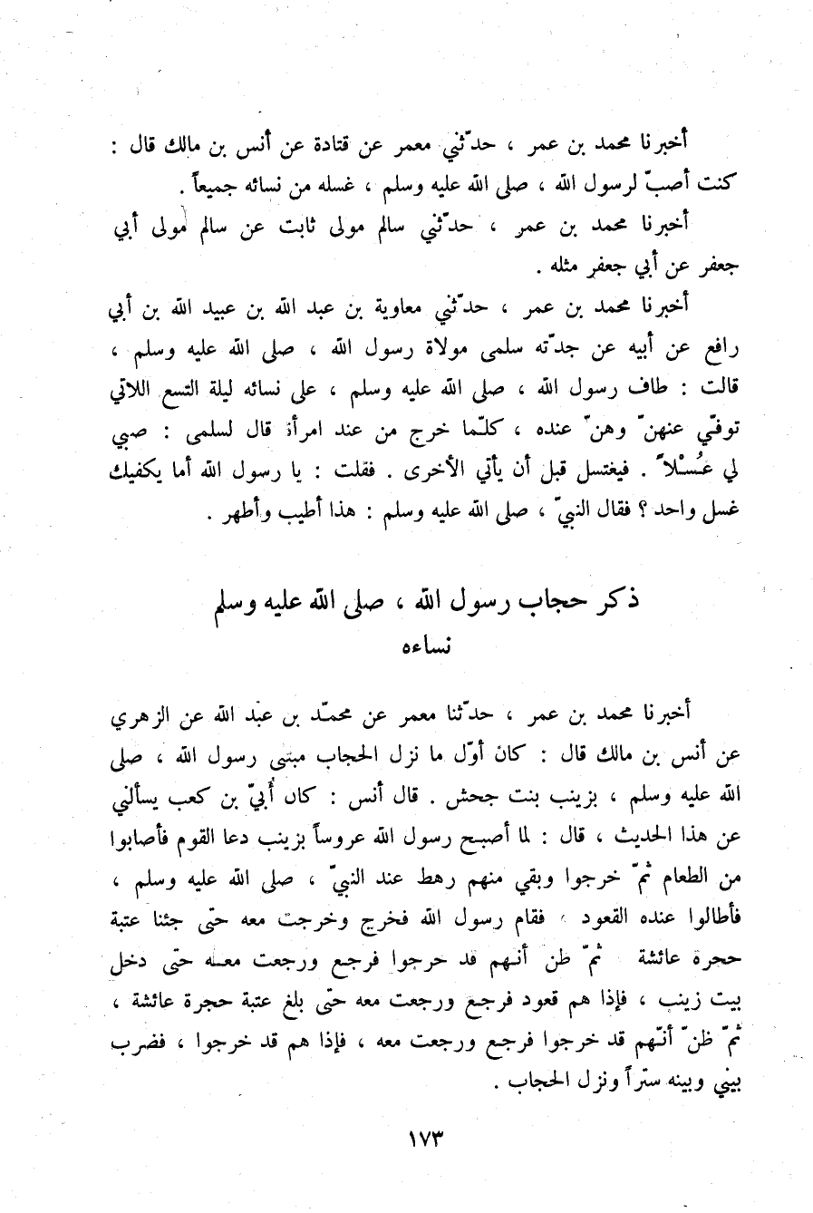 أَخْبَرَنَا مُحَمَّدُ بْنُ عُمَرَ، حَدَّثَنَا مَعْمَرٌ، عَنْ مُحَمَّدِ بْنِ عَبْدِ اللَّهِ، عَنِ الزُّهْرِيِّ، عَنْ أَنَسِ بْنِ مَالِكٍ قَالَ: " §كَانَ أَوَّلُ مَا نَزَلَ الْحِجَابُ مُبْتَنَى رَسُولِ اللَّهِ صلّى الله عليه وسلم بِزَيْنَبَ بِنْتِ جَحْشٍ قَالَ أَنَسٌ: كَانَ أُبَيُّ بْنُ كَعْبٍ يَسْأَلُنِي عَنْ هَذَا الْحَدِيثِ، قَالَ: لَمَّا أَصْبَحَ رَسُولُ اللَّهِ عَرُوسًا بِزَيْنَبَ دَعَا الْقَوْمَ فَأَصَابُوا مِنَ الطَّعَامِ ثُمَّ خَرَجُوا وَبَقِيَ مِنْهُمْ رَهْطٌ عِنْدَ النَّبِيِّ صلّى الله عليه وسلم فَأَطَالُوا عِنْدَهُ الْقُعُودَ فَقَامَ رَسُولُ اللَّهِ فَخَرَجَ وَخَرَجْتُ مَعَهُ حَتَّى جِئْنَا عَتَبَةَ حُجْرَةِ عَائِشَةَ ثُمَّ ظَنَّ أَنَّهُمْ قَدْ خَرَجُوا فَرَجَعَ وَرَجَعْتُ مَعَهُ حَتَّى دَخَلَ بَيْتَ زَيْنَبَ فَإِذَا هُمْ قُعُودٌ فَرَجَعَ وَرَجَعْتُ مَعَهُ حَتَّى بَلَغَ عَتَبَةَ حُجْرَةِ عَائِشَةَ ثُمَّ ظَنَّ أَنَّهُمْ قَدْ خَرَجُوا فَرَجَعَ وَرَجَعْتُ مَعَهُ فَإِذَا هُمْ قَدْ خَرَجُوا فَضَرَبْتُ بَيْنِي وَبَيْنَهُ سِتْرًا وَنَزَلَ الْحِجَابُ ".