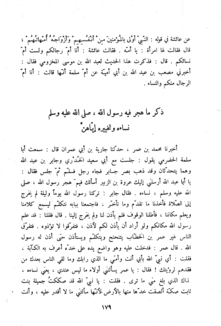 أَخْبَرَنَا مُحَمَّدُ بْنُ عُمَرَ، حَدَّثَنَا جَارِيَةُ بْنُ أَبِي عِمْرَانَ، قَالَ: سَمِعْتُ أَبَا سَلَمَةَ الْحَضْرَمِيَّ، يَقُولُ: جَلَسْتُ مَعَ أَبِي سَعِيدٍ الْخُدْرِيِّ وَجَابِرِ بْنِ عَبْدِ اللَّهِ وَهُمَا يَتَحَدَّثَانِ وَقَدْ ذَهَبَ بَصَرُ جَابِرٍ فَجَاءَ رَجُلٌ فَسَلَّمَ ثُمَّ جَلَسَ، فَقَالَ: يَا أَبَا عَبْدِ اللَّهِ أَرْسَلَنِي إِلَيْكَ عُرْوَةُ بْنُ الزُّبَيْرِ أَسْأَلُكَ فِيمَ هَجَرَ رَسُولُ اللَّهِ صلّى الله عليه وسلم نِسَاءَهُ؟ . فَقَالَ جَابِرٌ: تَرَكْنَا رَسُولَ اللَّهِ يَوْمًا وَلَيْلَةً لَمْ يَخْرُجْ إِلَى الصَّلَاةِ فَأَخَذْنَا مَا تَقَدَّمَ وَمَا تَأَخَّرَ فَاجْتَمَعْنَا بِبَابِهِ نَتَكَلَّمُ لَيَسْمَعَ كَلَامَنَا وَيَعْلَمَ مَكَانَنَا فَأَطَلْنَا الْوقُوفَ فَلَمْ يَأْذَنْ لَنَا وَلَمْ يَخْرُجْ إِلَيْنَا، فَقَالَ: فَقُلْنَا قَدْ عَلِمَ رَسُولُ اللَّهِ مَكَانَكُمْ، وَلَوْ أَرَادَ أَنْ يَأْذَنَ لَكُمْ لَأَذِنَ فَتَفَرَّقُوا لَا تُؤْذُوهُ، فَتَفَرَّقَ النَّاسُ غَيْرَ عُمَرَ بْنِ الْخَطَّابِ يَتَنَحْنَحُ وَيَتَكَلَّمُ وَيَسْتَأْذِنُ حَتَّى أَذِنَ لَهُ رَسُولُ اللَّهِ، قَالَ عُمَرُ: فَدَخَلْتُ عَلَيْهِ وَهُوَ وَاضِعٌ يَدَهُ عَلَى خَدِّهِ أَعْرِفُ بِهِ الْكَآبَةَ، فَقُلْتُ: أَيْ نَبِيَّ اللَّهِ بِأَبِي أَنْتَ وَأُمِّي مَا الَّذِي رَابَكَ وَمَا لَقِيَ النَّاسُ بَعْدَكَ مِنْ فَقْدِهِمْ لِرُؤْيَتِكَ؟ , فَقَالَ: «يَا عُمَرُ §يَسْأَلْنَنِي أُولَاءِ مَا لَيْسَ عِنْدِي يَعْنِي نِسَاءَهُ، فَذَاكَ الَّذِي بَلَغَ مِنِّي مَا تَرَى» ، فَقُلْتُ: يَا نَبِيَّ اللَّهِ قَدْ صَكَكْتُ جَمِيلَةَ بِنْتَ ثَابِتٍ صَكَّةً أَلْصَقْتُ خَدَّهَا مِنْهَا بِالْأَرْضِ لِأَنَّهَا سَأَلَتْنِي مَا لَا أَقْدِرُ عَلَيْهِ، وَأَنْتَ -[180]- يَا رَسُولَ اللَّهِ عَلَى مَوْعِدٍ مِنْ رَبِّكَ وَهُوَ جَاعِلٌ بَعْدَ الْعُسْرِ يَسْرًا، قَالَ: فَلَمْ أَزَلْ أُكَلِّمُهُ حَتَّى رَأَيْتُ رَسُولَ اللَّهِ قَدْ تَحَلَّلَ عَنْهُ بَعْضُ ذَلِكَ، قَالَ: فَخَرَجْتُ فَلَقِيتُ أَبَا بَكْرٍ الصِّدِّيقَ فَحَدَّثْتُهُ الْحَدِيثَ فَدَخَلَ أَبُو بَكْرٍ عَلَى عَائِشَةَ، فَقَالَ: قَدْ عَلِمْتُ أَنَّ رَسُولَ اللَّهِ لَا يَدَّخِرُ عَنْكُنَّ شَيْئًا فَلَا تَسْأَلْنَهُ مَا لَا يَجِدُ انْظُرِي حَاجَتَكِ فَاطْلُبِيهَا إِلَيَّ وَانْطَلَقَ عُمَرُ إِلَى حَفْصَةَ فَذَكَرَ لَهَا مِثْلَ ذَلِكَ ثُمَّ اتَّبَعَا أُمَّهَاتِ الْمُؤْمِنِينَ فَجَعَلَا يَذْكُرَانِ لَهُنَّ مِثْلَ ذَلِكَ حَتَّى دَخَلَا عَلَى أُمِّ سَلَمَةَ فَذَكَرَا لَهَا مِثْلَ ذَلِكَ فَقَالَتْ لَهُمَا أُمُّ سَلَمَةَ: مَا لَكُمَا وَلِمَا هَاهُنَا رَسُولُ اللَّهِ صلّى الله عليه وسلم أَعْلَى بِأَمْرِنَا عَيْنَا وَلَوْ أَرَادَ أَنْ يَنْهَانَا لَنَهَانَا , فَمَنْ نَسْأَلُ إِذَا لَمْ نَسْأَلْ رَسُولَ اللَّهِ؟ هَلْ يَدْخُلُ بَيْنَكُمَا وَبَيْنَ أَهْلِيكُمَا أَحَدٌ؟ فَمَا نُكَلِّفُكُمَا هَذَا. فَخَرَجَا مِنْ عِنْدِهَا، فَقَالَ أَزْوَاجُ النَّبِيِّ صلّى الله عليه وسلم لِأُمِّ سَلَمَةَ جَزَاكِ اللَّهُ خَيْرًا حِينَ فَعَلْتِ مَا فَعَلْتِ مَا قَدَرْنَا أَنْ نَرُدَّ عَلَيْهِمَا شَيْئًا. ثُمَّ قَالَ جَابِرٌ لِأَبِي سَعِيدٍ: أَلَمْ يَكُنِ الْحَدِيثُ هَكَذَا؟ , قَالَ: بَلَى وَقَدْ بَقِيَتْ مِنْهُ بَقِيَّةٌ، قَالَ جَابِرٌ: فَأَنَا آتِي عَلَى ذَلِكَ إِنْ شَاءَ اللَّهُ، ثُمَّ قَالَ: فَأَنْزَلَ اللَّهُ فِي ذَلِكَ {يَا أَيُّهَا النَّبِيُّ قُلْ لِأَزْوَاجِكَ إِنْ كُنْتُنَّ تُرِدْنَ الْحَيَاةَ الدُّنْيَا وَزِينَتَهَا فَتَعَالَيْنَ أُمَتِّعْكُنَّ وَأُسَرِّحْكُنَّ سَرَاحًا جَمِيلًا} [الأحزاب: 28] , يَعْنِي مُتْعَةَ الطَّلَاقِ وَيَعْنِي بِتَسْرِيحِهِنَّ تَطْلِيقَهُنَّ طَلَاقًا جَمِيلً