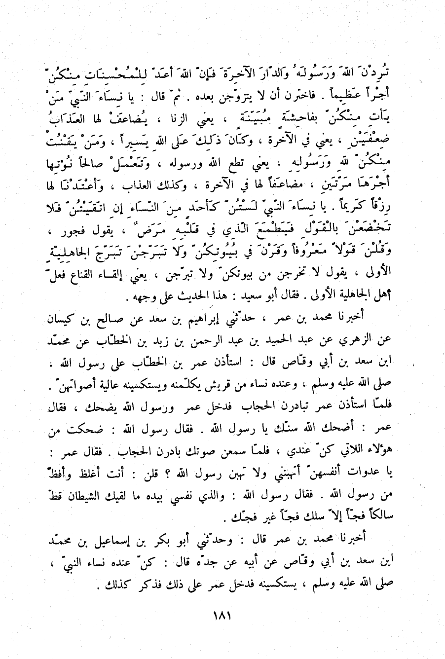 أَخْبَرَنَا مُحَمَّدُ بْنُ عُمَرَ، حَدَّثَنِي إِبْرَاهِيمُ بْنُ سَعْدٍ، عَنْ صَالِحِ بْنِ كَيْسَانَ، عَنِ الزُّهْرِيِّ، عَنْ عَبْدِ الْحَمِيدِ بْنِ عَبْدِ الرَّحْمَنِ بْنِ زَيْدِ بْنِ الْخَطَّابِ، عَنْ مُحَمَّدِ بْنِ سَعْدِ بْنِ أَبِي وَقَّاصٍ قَالَ: اسْتَأْذَنَ عُمَرُ بْنُ الْخَطَّابِ عَلَى رَسُولِ اللَّهِ صلّى الله عليه وسلم وَعِنْدَهُ نِسَاءٌ مِنْ قُرَيْشٍ يُكَلِّمْنَهُ وَيَسْتَكْسِينَهُ عَالِيَةٌ أَصْوَاتُهُنَّ. فَلَمَّا اسْتَأْذَنَ عُمَرُ تَبَادَرْنَ الْحِجَابَ فَدَخَلَ عُمَرُ وَرَسُولُ اللَّهِ يَضْحَكُ، فَقَالَ عُمَرُ: أَضْحَكَ اللَّهُ سِنَّكَ يَا رَسُولَ اللَّهِ، فَقَالَ رَسُولُ اللَّهِ: «§ضَحِكْتُ مِنْ هَؤُلَاءِ اللَّاتِي كُنَّ عِنْدِي فَلَمَّا سَمِعْنَ صَوْتَكَ بَادَرْنَ الْحِجَابَ» ، فَقَالَ عُمَرُ: يَا عَدُوَّاتِ أَنْفُسِهِنَّ أَتَهَبْنَنِي وَلَا تَهَبْنَ رَسُولَ اللَّهِ؟ , قُلْنَ: أَنْتَ أَغْلَظُ وَأَفَظُّ مِنْ رَسُولِ اللَّهِ، فَقَالَ رَسُولُ اللَّهِ: «وَالَّذِي نَفْسِي بِيَدِهِ مَا لَقِيَكَ الشَّيْطَانُ قَطُّ سَالِكًا فَجًّا إِلَّا سَلَكَ فَجًّا غَيْرَ فَجِّكَ»
