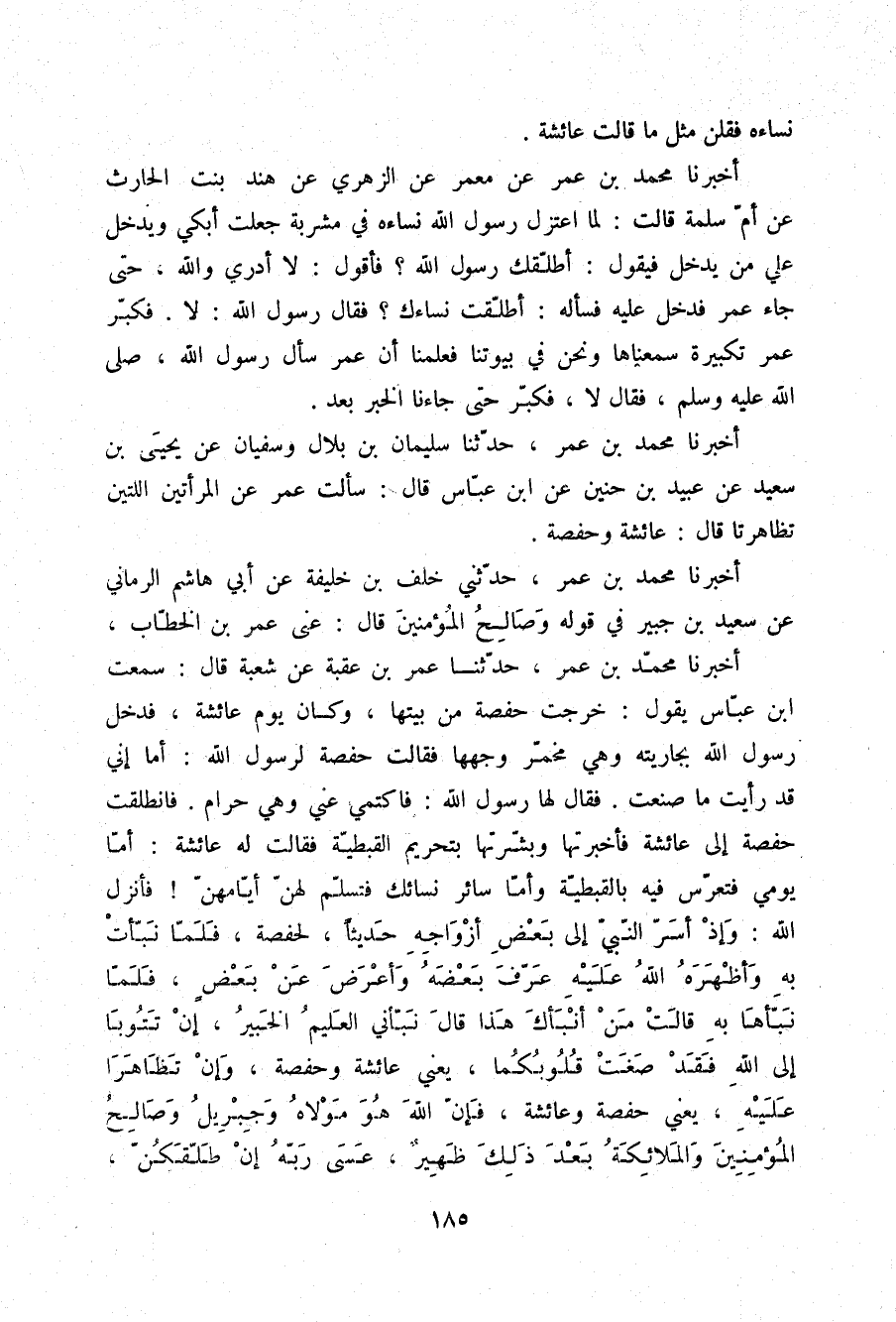 أَخْبَرَنَا مُحَمَّدُ بْنُ عُمَرَ، حَدَّثَنَا عُمَرُ بْنُ عُقْبَةَ، عَنْ شُعْبَةَ، قَالَ: سَمِعْتُ ابْنَ عَبَّاسٍ يَقُولُ: خَرَجَتْ حَفْصَةُ مِنْ بَيْتِهَا وَكَانَ يَوْمَ عَائِشَةَ فَدَخَلَ رَسُولُ اللَّهِ بِجَارِيَتِهِ وَهِيَ مُخَمَّرٌ وَجْهُهَا فَقَالَتْ حَفْصَةُ لِرَسُولِ اللَّهِ: أَمَا إِنِّي قَدْ رَأَيْتُ مَا صَنَعْتَ، فَقَالَ لَهَا رَسُولُ اللَّهِ: «§فَاكْتُمِي عَنِّي وَهِيَ حَرَامٌ» . فَانْطَلَقَتْ حَفْصَةُ إِلَى عَائِشَةَ فَأَخْبَرَتْهَا وَبَشَّرَتْهَا بِتَحْرِيمِ الْقِبْطِيَّةِ فَقَالَتْ لَهُ عَائِشَةُ: أَمَّا يَوْمِي فَتُعَرِّسُ فِيهِ بِالْقِبْطِيَّةِ وَأَمَّا سَائِرُ نِسَائِكَ فَتُسَلِّمُ لَهُنَّ أَيَّامَهُنَّ فَأَنْزَلَ اللَّهُ: {وَإِذْ أَسَرَّ النَّبِيُّ إِلَى بَعْضِ أَزْوَاجِهِ حَدِيثًا} [التحريم: 3] لِحَفْصَةَ {فَلَمَّا نَبَّأَتْ بِهِ وَأَظْهَرَهُ اللَّهُ عَلَيْهِ عَرَّفَ بَعْضَهُ وَأَعْرَضَ عَنْ بَعْضٍ فَلَمَّا نَبَّأَهَا بِهِ قَالَتْ مَنْ أَنْبَأَكَ هَذَا قَالَ نَبَّأَنِيَ الْعَلِيمُ الْخَبِيرُ , إِنْ تَتُوبَا إِلَى اللَّهِ فَقَدْ صَغَتْ قُلُوبُكُمَا} [التحريم: 4] , يَعْنِي عَائِشَةَ وَحَفْصَةَ , {وَإِنْ تَظَاهَرَا عَلَيْهِ} [التحريم: 4] , يَعْنِي حَفْصَةَ وَعَائِشَةَ , {فَإِنَّ اللَّهَ هُوَ مَوْلَاهُ وَجِبْرِيلُ وَصَالِحُ الْمُؤْمِنِينَ وَالْمَلَائِكَةُ بَعْدَ ذَلِكَ ظَهِيرٌ عَسَى رَبُّهُ إِنْ طَلَّقَكُنَّ} [التحريم: 4]