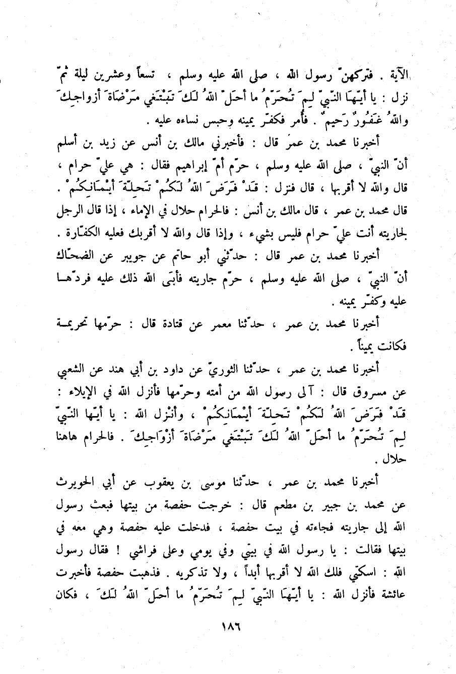 أَخْبَرَنَا مُحَمَّدُ بْنُ عُمَرَ، حَدَّثَنَا الثَّوْرِيُّ، عَنْ دَاوُدَ بْنِ أَبِي هِنْدٍ، عَنِ الشَّعْبِيِّ، عَنْ مَسْرُوقٍ قَالَ: §آلَى رَسُولُ اللَّهِ مِنْ أَمَتِهِ وَحَرَّمَهَا فَأَنْزَلَ اللَّهُ فِي الْإِيلَاءِ: {قَدْ فَرَضَ اللَّهُ لَكُمْ تَحِلَّةَ} [التحريم: 2] أَيْمَانِكُمْ وَأَنْزَلَ اللَّهُ: {يَا أَيُّهَا النَّبِيُّ لِمَ تُحَرِّمُ مَا أَحَلَّ اللَّهُ لَكَ تَبْتَغِي مَرْضَاةَ أَزْوَاجِكَ} . فَالْحَرَامُ هَا هُنَا حَلَالٌ ".
