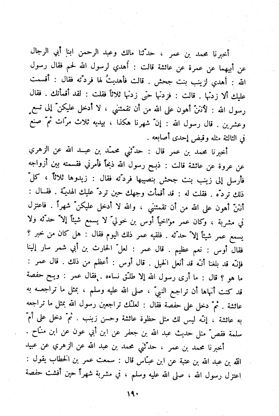 أَخْبَرَنَا مُحَمَّدُ بْنُ عُمَرَ، قَالَ: حَدَّثَنِي مُحَمَّدُ بْنُ عَبْدِ اللَّهِ، عَنِ الزُّهْرِيِّ، عَنْ عُرْوَةَ، عَنْ عَائِشَةَ قَالَتْ: ذَبَحَ رَسُولُ اللَّهِ ذَبْحًا فَأَمَرَنِي فَقَسَمْتُهُ بَيْنَ أَزْوَاجِهِ فَأَرْسَلَ إِلَى زَيْنَبَ بِنْتِ جَحْشٍ بِنَصِيبِهَا فَرَدَّتْهُ، فَقَالَ: «§زِيدُوهَا ثَلَاثًا» , كُلَّ ذَلِكَ تَرُدُّهُ فَقُلْتُ لَهُ: قَدْ أَقْمَأَتْ وَجْهَكَ حِينَ تَرُدُّ عَلَيْكَ الْهَدِيَّةَ، فَقَالَ: «أَنْتُنَّ أَهْوَنُ عَلَى اللَّهِ مِنْ أَنْ تُقْمِئْنَنِي وَاللَّهِ لَا أَدْخُلُ عَلَيْكُنَّ شَهْرًا» . فَاعْتَزَلَ فِي مَشْرُبَةٍ وَكَانَ عُمَرُ مُؤَاخِيًا أَوْسَ بْنَ خَوْلِيٍّ لَا يَسْمَعُ شَيْئًا إِلَّا حَدَّثَهُ وَلَا يَسْمَعُ عُمَرُ شَيْئًا إِلَّا حَدَّثَهُ , فَلَقِيَهُ عُمَرُ ذَلِكَ الْيَوْمَ، فَقَالَ: هَلْ كَانَ مِنْ خَبَرٍ، فَقَالَ أَوْسٌ: نَعَمْ عَظِيمٌ، قَالَ عُمَرُ: لَعَلَّ الْحَارِثَ بْنَ أَبِي شِمْرٍ سَارَ إِلَيْنَا فَإِنَّهُ قَدْ بَلَغَنَا أَنَّهُ قَدْ أَنْعَلَ الْخَيْلَ، قَالَ أَوْسٌ: أَعْظَمُ مِنْ ذَلِكَ، قَالَ عُمَرُ: مَا هُوَ؟ قَالَ: مَا أَرَى رَسُولَ اللَّهِ إِلَّا طَلَّقَ نِسَاءَهُ، فَقَالَ عُمَرُ: وَيْحَ حَفْصَةَ قَدْ كُنْتُ أَنْهَاهَا أَنْ تُرَاجِعَ النَّبِيَّ صلّى الله عليه وسلم بِمِثْلِ مَا تُرَاجِعُهُ بِهِ عَائِشَةُ ثُمَّ دَخَلَ عَلَى حَفْصَةَ، فَقَالَ: لَعَلَّكِ تُرَاجِعِينَ رَسُولَ اللَّهِ بِمِثْلِ مَا تُرَاجِعُهُ بِهِ عَائِشَةُ , إِنَّهُ لَيْسَ لَكِ مِثْلُ حَظْوَةِ عَائِشَةَ وَحُسْنُ زَيْنَبَ , ثُمَّ دَخَلَ عَلَى أُمِّ سَلَمَةَ فَقَصَّ مِثْلَ حَدِيثِ عَبْدِ اللَّهِ بْنِ جَعْفَرٍ عَنِ ابْنِ أَبِي عَوْنٍ عَنِ ابْنِ مَنَّاحٍ