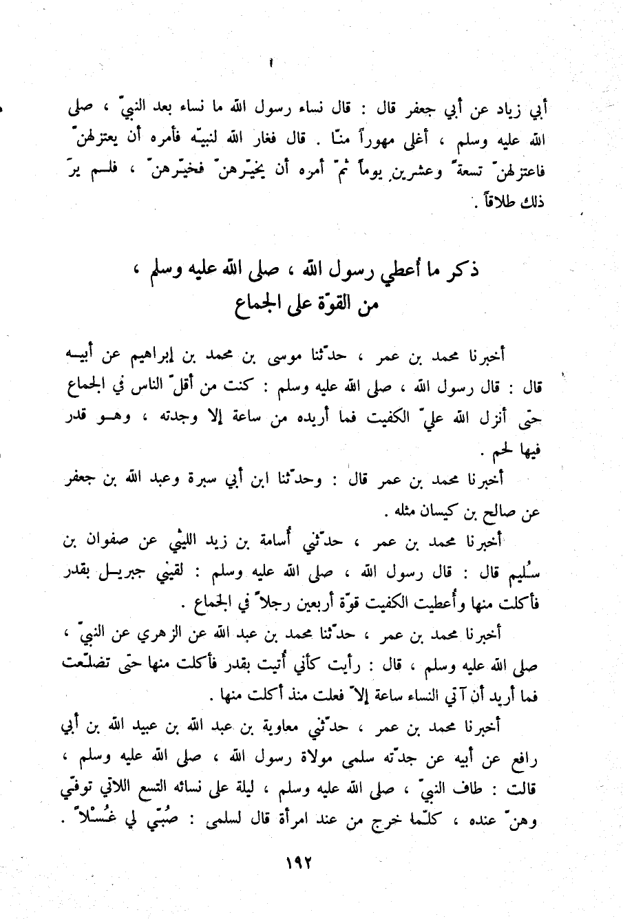 أَخْبَرَنَا مُحَمَّدُ بْنُ عُمَرَ، حَدَّثَنِي أُسَامَةُ بْنُ زَيْدٍ اللَّيْثِيُّ، عَنْ صَفْوَانَ بْنِ سُلَيْمٍ قَالَ: قَالَ رَسُولُ اللَّهِ صلّى الله عليه وسلم: «§لَقِيَنِي جِبْرِيلُ بِقِدْرٍ فَأَكَلْتُ مِنْهَا وَأُعْطِيتُ الْكَفِيتُ قُوَّةُ أَرْبَعِينَ رَجُلًا فِي الْجِمَاعِ»
