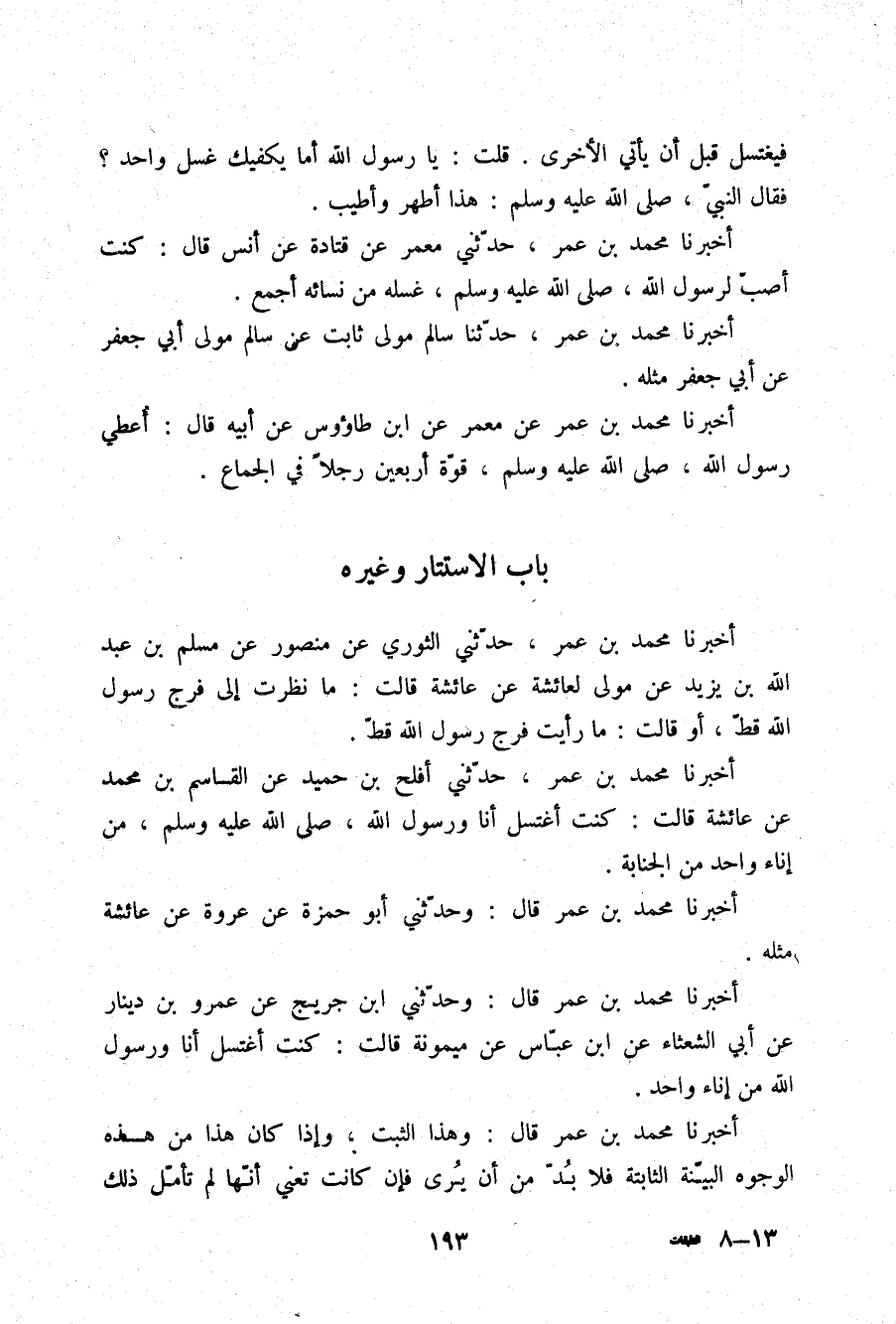 أَخْبَرَنَا مُحَمَّدُ بْنُ عُمَرَ، قَالَ: وَحَدَّثَنِي ابْنُ جُرَيْجٍ، عَنْ عَمْرِو بْنِ دِينَارٍ، عَنْ أَبِي الشَّعْثَاءِ، عَنِ ابْنِ عَبَّاسٍ، عَنْ مَيْمُونَةَ قَالَتْ: «§كُنْتُ أَغْتَسِلُ أَنَا وَرَسُولُ اللَّهِ مِنْ إِنَاءٍ وَاحِدٍ» أَخْبَرَنَا مُحَمَّدُ بْنُ عُمَرَ قَالَ: وَهَذَا الثَّبْتُ وَإِذَا كَانَ هَذَا مِنْ هَذِهِ الْوُجُوهِ الْبَيِّنَةِ الثَّابِتَةِ فَلَابُدَّ مِنْ أَنْ يُرَى فَإِنْ كَانَتْ تَعْنِي أَنَّهَا لَمْ تَأْمُلْ ذَلِكَ -[194]- فَهَذَا أَوْجَهُ , وَقَدْ يَرَى الْإِنْسَانُ مَا لَا يُرِيدُ النَّظَرَ إِلَيْهِ وَقَدْ رَأَيْتُ مَالِكَ بْنَ أَنَسٍ وَابْنَ أَبِي ذِئْبٍ لَا يَرَيَانِ بَأْسًا يَرَاهُ مِنْهَا وَتَرَاهُ مِنْهُ. وَقَالَ الثَّوْرِيُّ: أَنَا أَكْرَهُ أَنْ يَرَاهُ وَإِنْ رَآهُ فَلَا بَأْسَ