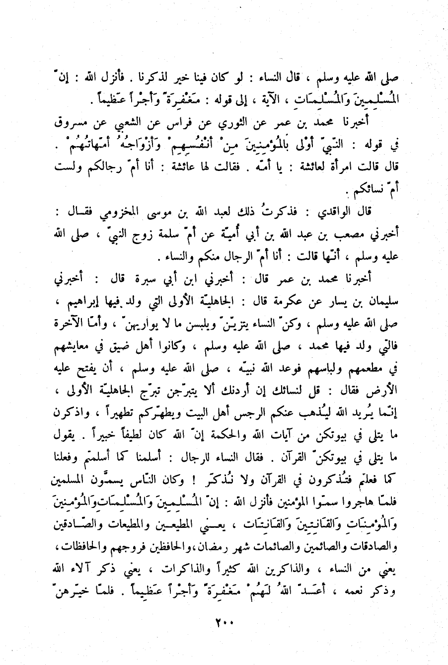 أَخْبَرَنَا مُحَمَّدُ بْنُ عُمَرَ، قَالَ: أَخْبَرَنِي ابْنُ أَبِي سَبْرَةَ، قَالَ: أَخْبَرَنِي سُلَيْمَانُ بْنُ يَسَارٍ، عَنْ عِكْرِمَةَ قَالَ: " §الْجَاهِلِيَّةُ الْأُولَى الَّتِي وُلِدَ فِيهَا إِبْرَاهِيمُ صلّى الله عليه وسلم وَكُنَّ النِّسَاءُ يَتَزَيَّنَّ وَيَلْبَسْنَ مَا لَا يُوَارِيهُنَّ وَأَمَّا الْآخِرَةُ فَالَّتِي وُلِدَ فِيهَا مُحَمَّدٌ صلّى الله عليه وسلم وَكَانُوا أَهْلَ ضِيقٍ فِي مَعَايِشِهِمْ فِي مَطْعَمِهِمْ وَلِبَاسِهِمْ , فَوَعَدَ اللَّهُ نَبِيَّهُ صلّى الله عليه وسلم أَنْ يَفْتَحَ عَلَيْهِ الْأَرْضَ، فَقَالَ: قُلْ لِنِسَائِكَ إِنْ أَرَدْنَكَ أَلَّا يَتَبَرَّجْنَ تَبَرُّجَ الْجَاهِلِيَّةِ الْأُولَى , {إِنَّمَا يُرِيدُ اللَّهُ لِيُذْهِبَ عَنْكُمُ الرِّجْسَ أَهْلَ الْبَيْتِ وَيُطَهِّرَكُمْ تَطْهِيرًا} [الأحزاب: 33] يَقُولُ: مَا يُتْلَى فِي بُيُوتِكُنَّ الْقُرْآنُ، فَقَالَ النِّسَاءُ لِلرِّجَالِ: أَسْلَمْنَا كَمَا أَسْلَمْتُمْ وَفَعَلْنَا كَمَا فَعَلْتُمْ فَتُذْكَرُونَ فِي الْقُرْآنِ وَلَا نُذَكَرُ وَكَانَ النَّاسُ يُسَمَّوْنَ الْمُسْلِمِينَ فَلَمَّا هَاجَرُوا سُمُّوا الْمُؤْمِنِينَ فَأَنْزَلَ اللَّهُ: {إِنَّ الْمُسْلِمِينَ وَالْمُسْلِمَاتِ وَالْمُؤْمِنِينَ وَالْمُؤْمِنَاتِ وَالْقَانِتِينَ وَالْقَانِتَاتِ} [الأحزاب: 35] , يَعْنِي الْمُطِيعِينَ وَالْمُطِيعَاتِ , {وَالصَّادِقِينَ وَالصَّادِقَاتِ وَالصَّابِرِينَ وَالصَّابِرَاتِ} [الأحزاب: 35] , شَهْرَ رَمَضَانَ , {وَالْحَافِظِينَ فُرُوجَهُمْ وَالْحَافِظَاتِ} [الأحزاب: 35] , يَعْنِي مِنَ النِّسَاءِ , {وَالذَّاكِرِينَ اللَّهَ كَثِيرًا وَالذَّاكِرَاتِ} [الأحزاب: 35] , يَعْنِي ذِكْرَ آلَاءِ اللَّهِ وَذِكْرَ نِعَمِهِ , {أَعَدَّ اللَّهُ لَهُمْ مَغْفِرَةً وَأَجْرًا عَظِيمًا} [الأحزاب: 35] . فَلَمَّا خَيَّرَهُنَّ