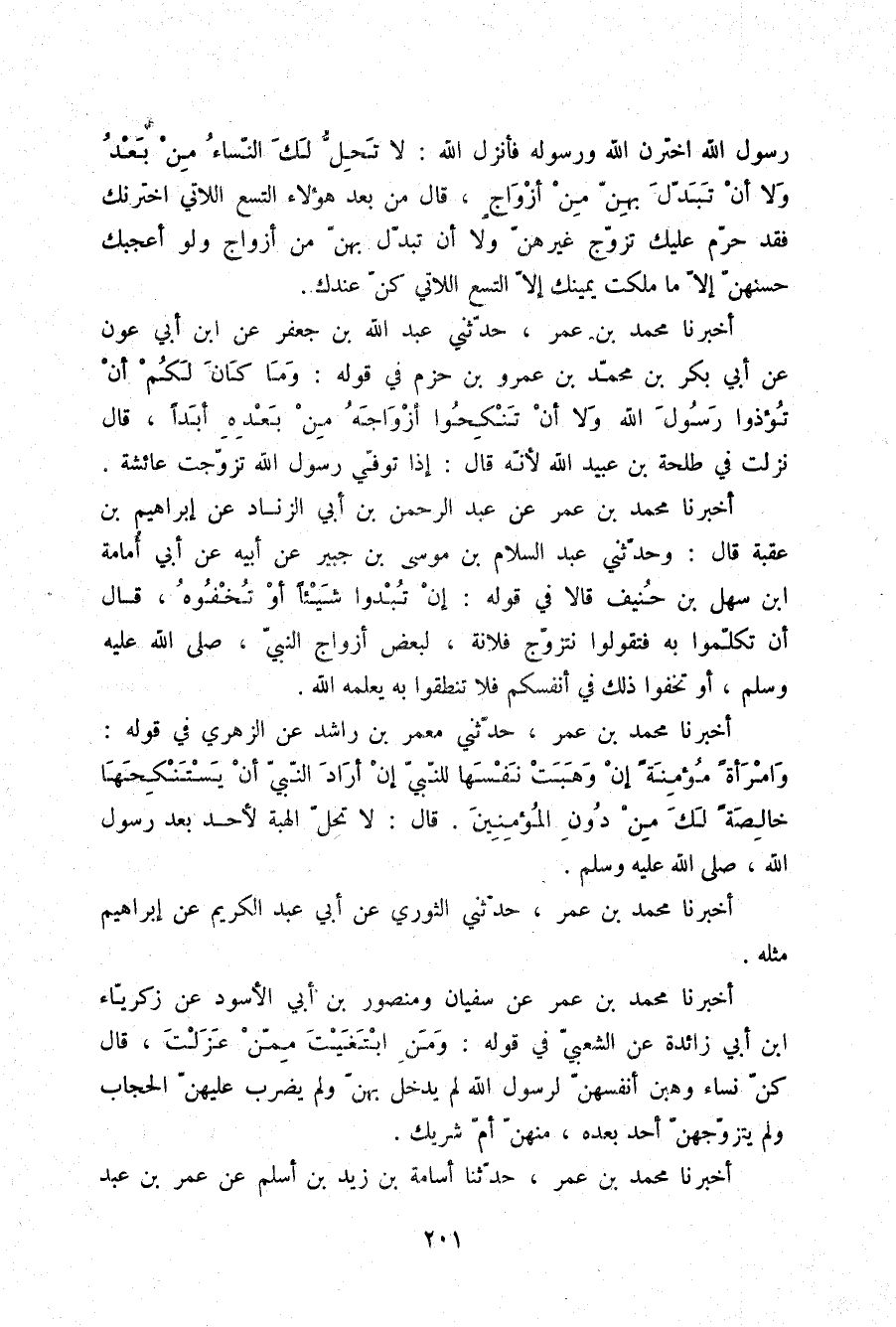 رَسُولُ اللَّهِ اخْتَرْنَ اللَّهَ وَرَسُولَهُ , فَأَنْزَلَ اللَّهُ: {لَا يَحِلُّ لَكَ النِّسَاءُ مِنْ بَعْدُ وَلَا أَنْ تَبَدَّلَ بِهِنَّ مِنْ أَزْوَاجٍ} [الأحزاب: 52] ، قَالَ: مِنْ بَعْدِ هَؤُلَاءِ التِّسْعِ اللَّاتِي اخْتَرْنَكَ فَقَدْ حُرِّمَ عَلَيْكَ تَزَوُّجُ غَيْرِهِنَّ {وَلَا أَنْ تَبَدَّلَ بِهِنَّ مِنْ أَزْوَاجٍ وَلَوْ أَعْجَبَكَ حُسْنُهُنَّ إِلَّا مَا مَلَكَتْ يَمِينُكَ} [الأحزاب: 52] إِلَّا التِّسْعَ اللَّاتِي كُنَّ عِنْدَكَ "