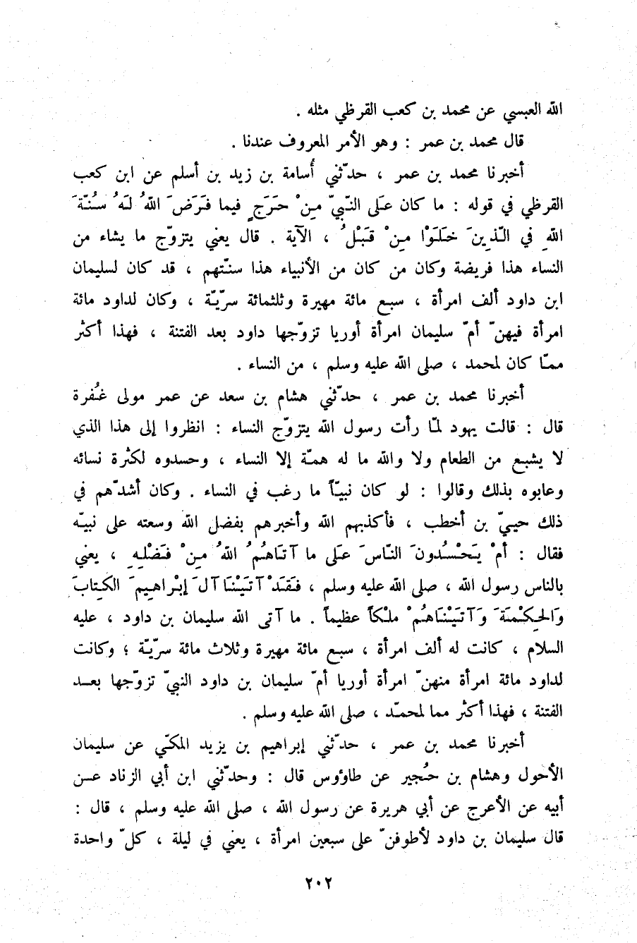 أَخْبَرَنَا مُحَمَّدُ بْنُ عُمَرَ، حَدَّثَنِي أُسَامَةُ بْنُ زَيْدِ بْنِ أَسْلَمَ، عَنِ ابْنِ كَعْبٍ الْقُرَظِيِّ، فِي قَوْلِهِ: {مَا كَانَ عَلَى النَّبِيِّ مِنْ حَرَجٍ فِيمَا فَرَضَ اللَّهُ لَهُ سُنَّةَ اللَّهِ فِي الَّذِينَ خَلَوْا مِنْ قَبْلُ} [الأحزاب: 38] الْآيَةَ، قَالَ: «§يَعْنِي يَتَزَوَّجُ مَا يَشَاءُ مِنَ النِّسَاءِ هَذَا فَرِيضَةٌ وَكَانَ مَنْ كَانَ مِنَ الْأَنْبِيَاءِ هَذَا سُنَّتُهُمْ , قَدْ كَانَ لِسُلَيْمَانَ بْنِ دَاوُدَ أَلْفُ امْرَأَةٍ سَبْعُ مِائَةِ مَهِيرَةٍ وَثَلَاثُمِائَةِ سُرِّيَّةٍ , وَكَانَ لِدَاوُدَ مِائَةُ امْرَأَةٍ فِيهِنَّ أُمُّ سُلَيْمَانَ امْرَأَةٌ أُورِيَا تَزَوَّجَهَا دَاوُدُ بَعْدَ الْفِتْنَةِ , فَهَذَا أَكْثَرُ مِمَّا كَانَ لِمُحَمَّدٍ صلّى الله عليه وسلم مِنَ النِّسَاءِ»