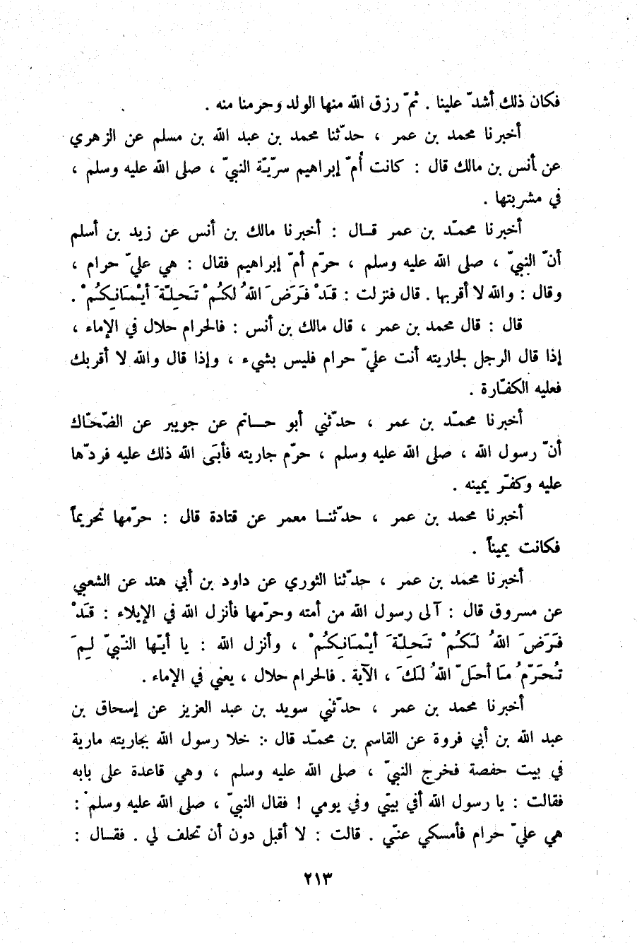 أَخْبَرَنَا مُحَمَّدُ بْنُ عُمَرَ، قَالَ: أَخْبَرَنَا مَالِكُ بْنُ أَنَسٍ، عَنْ زَيْدِ بْنِ أَسْلَمَ , أَنَّ النَّبِيَّ صلّى الله عليه وسلم حَرَّمَ أُمَّ إِبْرَاهِيمَ، فَقَالَ: «§هِيَ عَلَيَّ حَرَامٌ» ، وَقَالَ: «وَاللَّهِ لَا أَقْرَبُهَا» ، قَالَ: فَنَزَلَتْ: {قَدْ فَرَضَ اللَّهُ لَكُمْ تَحِلَّةَ أَيْمَانِكُمْ} [التحريم: 2] . قَالَ: قَالَ مُحَمَّدُ بْنُ عُمَرَ: قَالَ مَالِكُ بْنُ أَنَسٍ: فَالْحَرَامُ حَلَالٌ فِي الْإِمَاءِ إِذَا قَالَ الرَّجُلُ لِجَارِيَتِهِ: أَنْتِ عَلَيَّ حَرَامٌ فَلَيْسَ بِشَيْءٍ , وَإِذَا قَالَ: وَاللَّهِ لَا أَقْرَبُكِ فَعَلَيْهِ الْكَفَّارَةُ