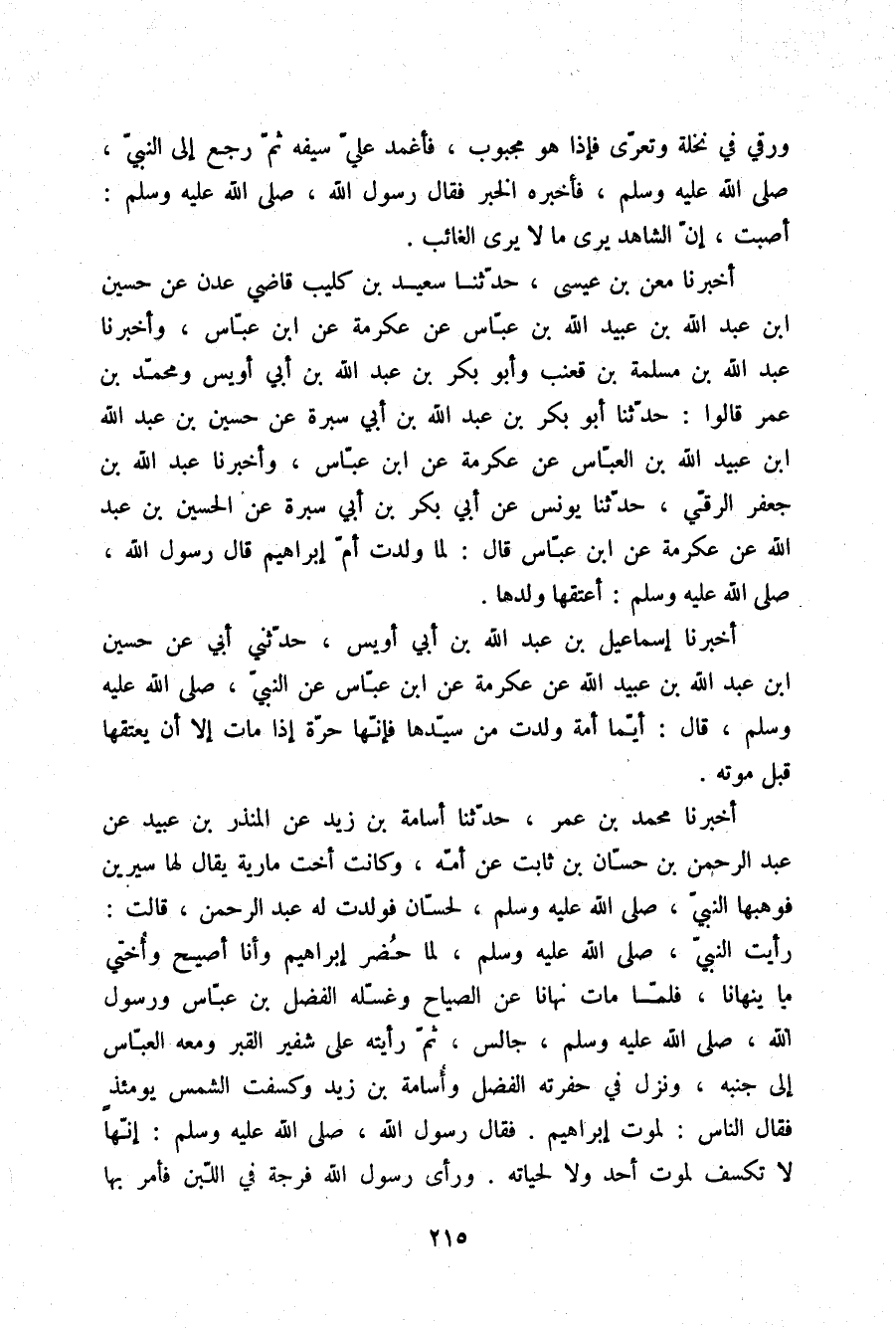أَخْبَرَنَا مَعْنُ بْنُ عِيسَى، حَدَّثَنَا سَعِيدُ بْنُ كُلَيْبٍ، قَاضِي عَدْنٍ، عَنْ حُسَيْنِ بْنِ عَبْدِ اللَّهِ بْنِ عُبَيْدِ اللَّهِ بْنِ عَبَّاسٍ، عَنْ عِكْرِمَةَ، عَنِ ابْنِ عَبَّاسٍ، وَأَخْبَرَنَا عَبْدُ اللَّهِ بْنُ مَسْلَمَةَ بْنِ قَعْنَبٍ، وَأَبُو بَكْرِ بْنُ عَبْدِ اللَّهِ بْنِ أَبِي أُوَيْسٍ وَمُحَمَّدُ بْنُ عُمَرَ، قَالُوا: حَدَّثَنَا أَبُو بَكْرِ بْنُ عَبْدِ اللَّهِ بْنِ أَبِي سَبْرَةَ، عَنْ حُسَيْنِ بْنِ عَبْدِ اللَّهِ بْنِ عُبَيْدِ اللَّهِ بْنِ الْعَبَّاسِ، عَنْ عِكْرِمَةَ، عَنِ ابْنِ عَبَّاسٍ، وَأَخْبَرَنَا عَبْدُ اللَّهِ بْنُ جَعْفَرٍ الرَّقِّيُّ , حَدَّثَنَا يُونُسُ عَنْ أَبِي بَكْرِ بْنِ أَبِي سَبْرَةَ، عَنِ الْحُسَيْنِ بْنِ عَبْدِ اللَّهِ، عَنْ عِكْرِمَةَ، عَنِ ابْنِ عَبَّاسٍ قَالَ: لَمَّا وَلَدَتْ أُمُّ إِبْرَاهِيمَ، قَالَ رَسُولُ اللَّهِ صلّى الله عليه وسلم: «§أَعْتَقَهَا وَلَدُهَا» .