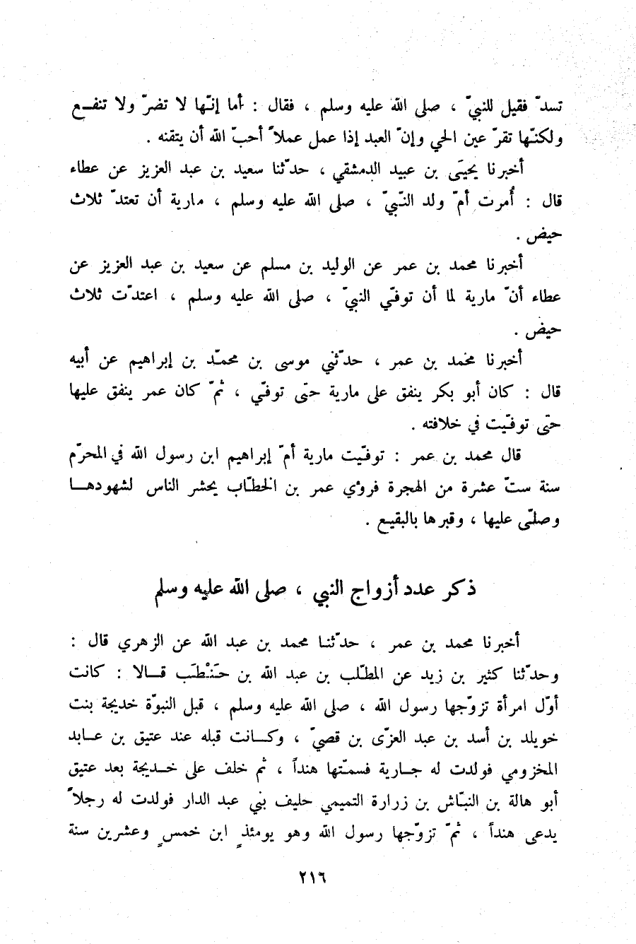 §ذِكْرُ عَدَدِ أَزْوَاجِ النَّبِيِّ صلّى الله عليه وسلم أَخْبَرَنَا مُحَمَّدُ بْنُ عُمَرَ، حَدَّثَنَا مُحَمَّدُ بْنُ عَبْدِ اللَّهِ، عَنِ الزُّهْرِيِّ، قَالَ: وَحَدَّثَنَا كَثِيرُ بْنُ زَيْدٍ، عَنِ الْمُطَّلِبِ بْنِ عَبْدِ اللَّهِ بْنِ حَنْطَبٍ قَالَا: كَانَتْ أَوَّلُ امْرَأَةٍ تَزَوَّجَهَا رَسُولُ اللَّهِ صلّى الله عليه وسلم قَبْلَ النُّبُوَّةِ خَدِيجَةَ بِنْتَ خُوَيْلِدِ بْنِ أَسَدِ بْنِ عَبْدِ الْعُزَّى بْنِ قُصَيٍّ , وَكَانَتْ قَبْلَهُ عِنْدَ عَتِيقِ بْنِ عَابِدٍ الْمَخْزُومِيِّ , فَوَلَدَتْ لَهُ جَارِيَةً فَسَمَّتْهَا هِنْدًا , ثُمَّ خَلَفَ عَلَى خَدِيجَةَ بَعْدَ عَتِيقٍ أَبُو هَالَةَ بْنُ النَّبَّاشِ بْنِ زُرَارَةَ التَّمِيمِيُّ حَلِيفُ بَنِي عَبْدِ الدَّارِ , فَوَلَدَتْ لَهُ رَجُلًا يُدْعَى هِنْدًا ثُمَّ , تَزَوَّجَهَا رَسُولُ اللَّهِ وَهُوَ يَوْمَئِذِ ابْنُ خَمْسٍ وَعِشْرِينَ سَنَةً