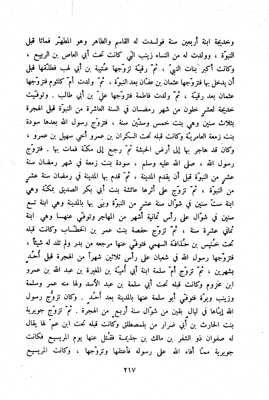 وَخَدِيجَةُ ابْنَةُ أَرْبَعِينَ سَنَةً فَوَلَدَتْ لَهُ الْقَاسِمَ وَالطَّاهِرَ وَهُوَ الْمُطَهَّرُ فَمَاتَا قَبْلَ النُّبُوَّةِ , وَوَلَدَتْ لَهُ مِنَ النِّسَاءِ زَيْنَبَ الَّتِي كَانَتْ تَحْتَ أَبِي الْعَاصِ بْنِ الرَّبِيعِ , وَكَانَتْ أَكْبَرَ بَنَاتِ النَّبِيِّ ثُمَّ رُقَيَّةَ تَزَوَّجَهَا عُتَيْبَةُ بْنُ أَبِي لَهَبٍ فَطَلَّقَهَا قَبْلَ أَنْ يَدْخُلَ بِهَا فَتَزَوَّجَهَا عُثْمَانُ بْنُ عَفَّانَ بَعْدَ النُّبُوَّةِ , ثُمَّ وَلَدَتْ لَهُ أُمَّ كُلْثُومٍ فَتَزَوَّجَهَا عُثْمَانُ بَعْدَ رُقَيَّةَ ثُمَّ وَلَدَتْ فَاطِمَةَ فَتَزَوَّجَهَا عَلِيُّ بْنُ أَبِي طَالِبٍ , وَتُوُفِّيَتْ خَدِيجَةُ لِعَشْرٍ خَلَوْنَ مِنْ شَهْرِ رَمَضَانَ فِي السَّنَةِ الْعَاشِرَةِ مِنَ النُّبُوَّةِ قَبْلَ الْهِجْرَةِ بِثَلَاثِ سِنِينَ وَهِيَ بِنْتُ خَمْسٍ وَسِتِّينَ سَنَةً , فَتَزَوَّجَ رَسُولُ اللَّهِ بَعْدَهَا سَوْدَةَ بِنْتَ زَمْعَةَ الْعَامِرِيَّةَ , وَكَانَتْ قَبْلَهُ تَحْتَ السَّكْرَانِ بْنِ عَمْرٍو أَخِي سُهَيْلِ بْنِ عَمْرٍو , وَكَانَ قَدْ هَاجَرَ بِهَا إِلَى أَرْضِ الْحَبَشَةِ ثُمَّ رَجَعَ إِلَى مَكَّةَ فَمَاتَ بِهَا , فَتَزَوَّجَ رَسُولُ اللَّهِ صلّى الله عليه وسلم سَوْدَةَ بِنْتَ زَمْعَةَ فِي شَهْرِ رَمَضَانَ سَنَةَ عَشْرٍ مِنَ النُّبُوَّةِ قَبْلَ أَنْ يَقْدَمَ الْمَدِينَةَ , ثُمَّ قَدِمَ بِهَا الْمَدِينَةَ فِي رَمَضَانَ سَنَةَ عَشْرٍ مِنَ النُّبُوَّةِ , ثُمَّ تَزَوَّجَ عَلَى أَثَرِهَا عَائِشَةَ بِنْتَ أَبِي بَكْرٍ الصِّدِّيقِ بِمَكَّةَ وَهِيَ ابْنَةُ سِتِّ سِنِينَ فِي شَوَّالٍ سَنَةَ عَشْرٍ مِنَ النُّبُوَّةِ , وَبَنَى بِهَا بِالْمَدِينَةِ وَهِيَ ابْنَةُ تِسْعِ سِنِينَ فِي شَوَّالٍ عَلَى رَأْسِ ثَمَانِيَةِ أَشْهُرٍ مِنَ الْمُهَاجِرِ وَتُوُفِّيَ عَنْهَا وَهِيَ ابْنَةُ ثَمَانِيَ عَشْرَةَ سَنَةً , ثُمَّ تَزَوَّجَ حَفْصَةَ بِنْتَ عُمَرَ بْنِ الْخَطَّابِ وَكَانَتْ قَبْلَهُ تَحْتَ خُنَيْسِ بْنِ حُذَافَةَ السَّهْمِيِّ فَتُوُفِّيَ عَنْهَا مَرْجِعَهُ مِنْ بَدْرٍ وَلَمْ تَلِدْ لَهُ شَيْئًا , فَتَزَوَّجَهَا رَسُولُ اللَّهِ فِي شَعْبَانَ عَلَى رَأْسِ ثَلَاثِينَ شَهْرًا مِنَ الْهِجْرَةِ قَبْلَ أُحُدٍ بِشَهْرَيْنِ ثُمَّ تَزَوَّجَ أُمَّ سَلَمَةَ ابْنَةَ أَبِي أُمَيَّةَ بْنِ الْمُغِيرَةِ بْنِ عَبْدِ اللَّهِ بْنِ عُمَرَ بْنِ مَخْزُومٍ , وَكَانَتْ قَبْلَهُ تَحْتَ أَبِي سَلَمَةَ بْنِ عَبْدِ الْأَسَدِ , وَلَهَا مِنْهُ عُمَرُ وَسَلَمَةُ وَزَيْنَبُ وَبَرَّةُ فَتُوُفِّيَ أَبُو سَلَمَةَ عَنْهَا بِالْمَدِينَةِ بَعْدَ أُحُدٍ , وَكَانَ تَزَوَّجَ رَسُولُ اللَّهِ إِيَّاهَا فِي لَيَالٍ بَقِينَ مِنْ شَوَّالٍ سَنَةَ أَرْبَعٍ مِنَ الْهِجْرَةِ , ثُمَّ تَزَوَّجَ جُوَيْرِيَةَ بِنْتَ الْحَارِثِ بْنِ أَبِي ضِرَارٍ مِنْ بَنِي الْمُصْطَلِقِ , وَكَانَتْ قَبْلَهُ تَحْتَ ابْنِ عَمٍّ لَهَا يُقَالُ لَهُ صَفْوَانُ ذُو الشَّفْرِ بْنِ مَالِكِ بْنِ جَذِيمَةَ فَقُتِلَ عَنْهَا يَوْمَ الْمُرَيْسِيعِ فَكَانَتْ جُوَيْرِيَةُ مِمَّا أَفَاءَ اللَّهُ عَلَى رَسُولِهِ فَأَعْتَقَهَا وَتَزَوَّجَهَا , وَكَانَتِ الْمُرَيْسِيعُ