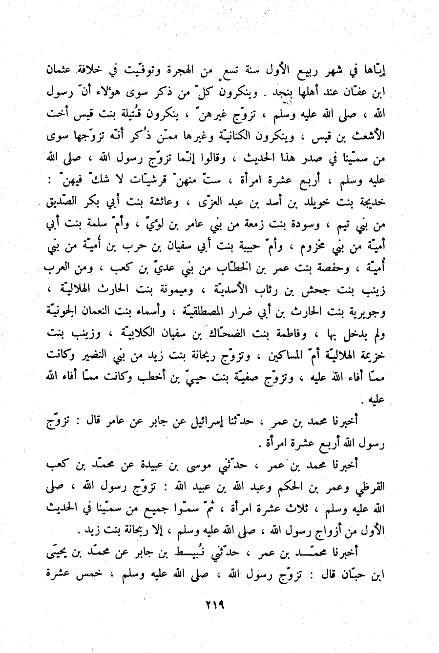 إِيَّاهَا فِي شَهْرِ رَبِيعٍ الْأَوَّلِ سَنَةَ تِسْعٍ مِنَ الْهِجْرَةِ وَتُوُفِّيَتْ فِي خِلَافَةِ عُثْمَانَ بْنِ عَفَّانَ عِنْدَ أَهْلِهَا بِنَجْدٍ , وَيُنْكِرُونَ كُلَّ مَنْ ذُكِرَ سِوَى هَؤُلَاءِ أَنَّ رَسُولَ اللَّهِ صلّى الله عليه وسلم تَزَوَّجَ غَيْرَهُنَّ يُنْكِرُونَ , قُتَيْلَةَ بِنْتَ قَيْسٍ أُخْتَ الْأَشْعَثَ بْنِ قَيْسِ وَيُنْكِرُونَ الْكِنَانِيَّةَ وَغَيْرَهَا مِمَّنْ ذُكِرَ أَنَّهُ تَزَوَّجَهَا سِوَى مَنْ سَمَّيْنَا فِي صَدْرِ هَذَا الْحَدِيثِ , وَقَالُوا: إِنَّمَا تَزَوَّجَ رَسُولُ اللَّهِ صلّى الله عليه وسلم أَرْبَعَ عَشْرَةَ امْرَأَةً , سِتٌّ مِنْهُنَّ قُرَشِيَّاتٌ لَا شَكَّ فِيهِنَّ: خَدِيجَةُ بِنْتُ خُوَيْلِدِ بْنِ أَسَدِ بْنِ عَبْدِ الْعُزَّى , وَعَائِشَةُ بِنْتُ أَبِي بَكْرٍ الصِّدِّيقِ مِنْ بَنِي تَيْمٍ , وَسَوْدَةُ بِنْتُ زَمْعَةَ مِنْ بَنِي عَامِرِ بْنِ لُؤَيٍّ , وَأُمُّ سَلَمَةَ بِنْتُ أَبِي أُمَيَّةَ مِنْ بَنِي مَخْزُومٍ , وَأُمُّ حَبِيبَةَ بِنْتُ أَبِي سُفْيَانَ بْنِ حَرْبِ بْنِ أُمَيَّةَ مِنْ بَنِي أُمَيَّةَ , وَحَفْصَةُ بِنْتُ عُمَرَ بْنِ الْخَطَّابِ مِنْ بَنِي عَدِيِّ بْنِ كَعْبٍ , وَمِنَ الْعَرَبِ: زَيْنَبُ بِنْتُ جَحْشِ بْنِ رِيَابٍ الْأَسَدِيَّةُ , وَمَيْمُونَةُ بِنْتُ الْحَارِثِ الْهِلَالِيَّةُ , وَجُوَيْرِيَةُ بِنْتُ الْحَارِثِ بْنِ أَبِي ضِرَارٍ الْمُصْطَلَقِيَّةُ , وَأَسْمَاءُ بِنْتُ النُّعْمَانِ الْجُونِيَّةُ وَلَمْ يَدْخُلْ بِهَا , وَفَاطِمَةُ بِنْتُ الضَّحَّاكِ بْنِ سُفْيَانَ الْكِلَابِيَّةُ , وَزَيْنَبُ بِنْتُ خُزَيْمَةَ الْهِلَالِيَّةُ أُمُّ الْمَسَاكِينِ , وَتَزَوَّجَ رَيْحَانَةَ بِنْتَ زَيْدِ مِنْ بَنِي النَّضِيرِ وَكَانَتْ مِمَّا أَفَاءَ اللَّهُ عَلَيْهِ , وَتَزَوَّجَ صَفِيَّةَ بِنْتَ حُيَيِّ بْنِ أَخْطَبَ وَكَانَتْ مِمَّا أَفَاءَ اللَّهُ عَلَيْهِ