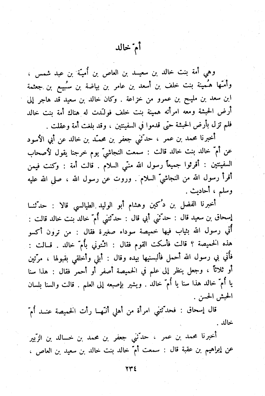 §أُمُّ خَالِدٍ وَهِيَ أَمَةُ بِنْتُ خَالِدِ بْنِ سَعِيدِ بْنِ الْعَاصِ بْنِ أُمَيَّةَ بْنِ عَبْدِ شَمْسٍ , وَأُمُّهَا هُمَيْنَةُ بِنْتُ خَلَفِ بْنِ أَسْعَدَ بْنِ عَامِرِ بْنِ بَيَاضَةَ بْنِ سُبَيْعِ بْنِ جَعْثَمَةَ بْنِ سَعْدِ بْنِ مَلِيحِ بْنِ عَمْرٍو مِنْ خُزَاعَةَ , وَكَانَ خَالِدُ بْنُ سَعِيدٍ قَدْ هَاجَرَ إِلَى أَرْضِ الْحَبَشَةِ وَمَعَهُ امْرَأَتُهُ هُمَيْنَةُ بِنْتُ خَلَفٍ فَوَلَدَتْ لَهُ هُنَاكَ أَمَةَ بِنْتَ خَالِدٍ فَلَمْ تَزَلْ بِأَرْضِ الْحَبَشَةِ حَتَّى قَدِمُوا فِي السَّفِينَتَيْنِ وَقَدْ بَلَغَتْ أَمَةُ وَعَقِلَتْ. أَخْبَرَنَا مُحَمَّدُ بْنُ عُمَرَ، حَدَّثَنِي جَعْفَرُ بْنُ مُحَمَّدِ بْنِ خَالِدٍ، عَنْ أَبِي الْأَسْوَدِ، عَنْ أُمِّ خَالِدِ بِنْتِ خَالِدٍ قَالَتْ: سَمِعْتُ النَّجَاشِيَّ يَوْمَ خَرَجْنَا يَقُولُ لِأَصْحَابِ السَّفِينَتَيْنِ: أَقْرِئُوا جَمِيعًا رَسُولَ اللَّهِ مِنِّيَ السَّلَامَ ". قَالَتْ أَمَةُ: وَكُنْتُ فِيمَنْ أَقْرَأَ رَسُولَ اللَّهِ مِنَ النَّجَاشِيِّ السَّلَامَ وَرَوَتْ عَنْ رَسُولِ اللَّهِ صلّى الله عليه وسلم أَحَادِيثَ