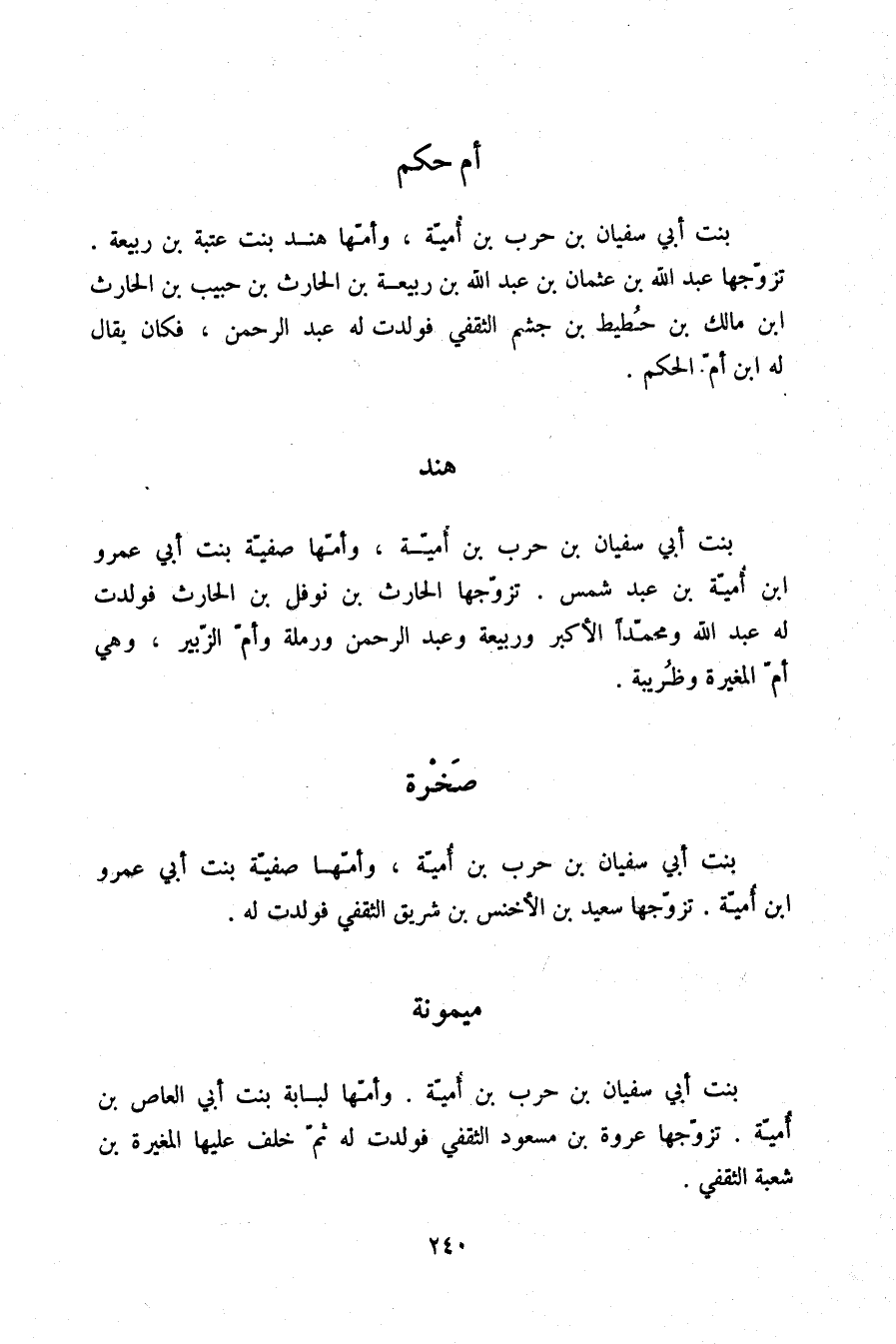 §صَخْرَةُ بِنْتُ أَبِي سُفْيَانَ بْنِ حَرْبِ بْنِ أُمَيَّةَ وَأُمُّهَا صَفِيَّةُ بِنْتُ أَبِي عَمْرِو بْنِ أُمَيَّةَ تَزَوَّجَهَا سَعِيدُ بْنُ الْأَخْنَسِ بْنِ شَرِيقٍ الثَّقَفِيُّ فَوَلَدَتْ لَهُ