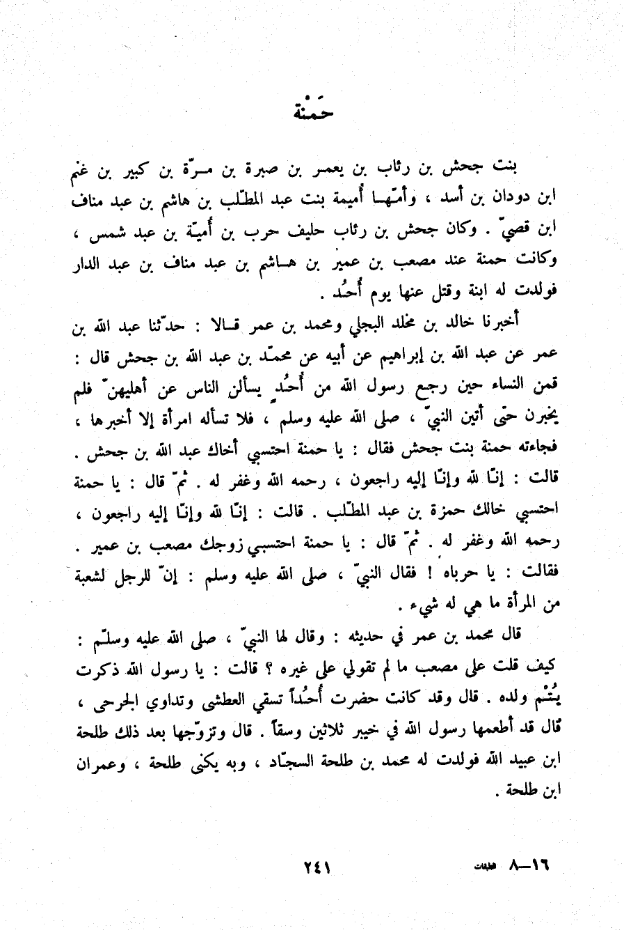 أَخْبَرَنَا خَالِدُ بْنُ مَخْلَدٍ الْبَجَلِيُّ، وَمُحَمَّدُ بْنُ عُمَرَ، قَالَا: حَدَّثَنَا عَبْدُ اللَّهِ بْنُ عُمَرَ، عَنْ عَبْدِ اللَّهِ بْنِ إِبْرَاهِيمَ، عَنْ أَبِيهِ، عَنْ مُحَمَّدِ بْنِ عَبْدِ اللَّهِ بْنِ جَحْشٍ قَالَ: §قُمْنَ النِّسَاءُ حِينَ رَجَعَ رَسُولُ اللَّهِ مِنْ أُحُدٍ يَسْأَلْنَ النَّاسَ عَنْ أَهْلِيهِنَّ فَلَمْ يُخْبَرْنَ حَتَّى أَتَيْنَ النَّبِيَّ صلّى الله عليه وسلم فَلَا تَسْأَلُهُ امْرَأَةٌ إِلَّا أَخْبَرَهَا , فَجَاءَتْهُ حَمْنَةُ بِنْتُ جَحْشٍ، فَقَالَ: «يَا حَمْنَةُ احْتَسِبِي أَخَاكِ عَبْدَ اللَّهِ بْنَ جَحْشٍ» ، قَالَتْ: {إِنَّا لِلَّهِ وَإِنَّا إِلَيْهِ رَاجِعُونَ} [البقرة: 156] رَحِمَهُ اللَّهُ وَغَفَرَ لَهُ , ثُمَّ قَالَ: «يَا حَمْنَةُ احْتَسِبِي خَالَكِ حَمْزَةَ بْنَ عَبْدِ الْمُطَّلِبِ» ، قَالَتْ: إِنَّا لِلَّهِ وَإِنَّا إِلَيْهِ رَاجِعُونَ رَحِمَهُ اللَّهُ وَغَفَرَ لَهُ , ثُمَّ قَالَ: «يَا حَمْنَةُ احْتَسِبِي زَوْجَكِ مُصْعَبَ بْنَ عُمَيْرٍ» , فَقَالَتْ: يَا حَرْبَاهُ، فَقَالَ: النَّبِيُّ صلّى الله عليه وسلم: «إِنَّ لِلرَّجُلِ لَشُعْبَةٌ مِنَ الْمَرْأَةِ مَا هِيَ لَهُ شَيْءٌ» . قَالَ مُحَمَّدُ بْنُ عُمَرَ فِي حَدِيثِهِ: وَقَالَ لَهَا النَّبِيُّ صلّى الله عليه وسلم: «كَيْفَ قُلْتِ عَلَى مُصْعَبٍ مَا لَمْ تَقُولِي عَلَى غَيْرِهِ؟» ، قَالَتْ: يَا رَسُولَ اللَّهِ ذَكَرْتُ يُتْمَ وَلَدِهِ، قَالَ: وَقَدْ كَانَتْ حَضَرَتْ أُحُدًا تَسْقِي الْعَطْشَى وَتُدَاوِي الْجَرْحَى، قَالَ: وَقَدْ أَطْعَمَهَا رَسُولُ اللَّهِ فِي خَيْبَرَ ثَلَاثِينَ وَسْقًا، قَالَ: وَتَزَوَّجَهَا بَعْدَ ذَلِكَ طَلْحَةُ بْنُ عُبَيْدِ اللَّهِ فَوَلَدَتْ لَهُ مُحَمَّدَ بْنَ طَلْحَةَ السَّجَّادَ وَبِهِ يُكَنَّى طَلْحَةُ وَعِمْرَانَ بْنَ طَلْحَةَ