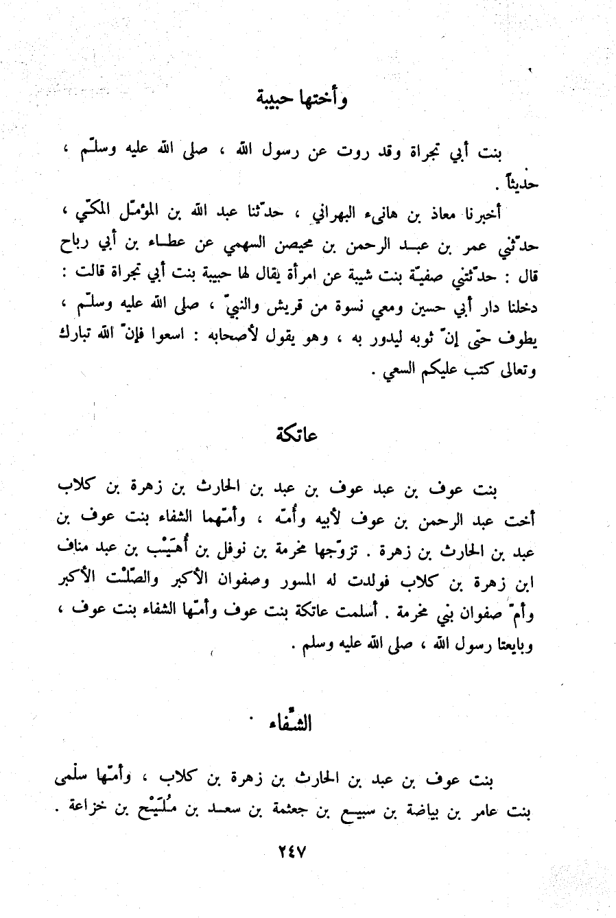§الشِّفَاءُ بِنْتُ عَوْفِ بْنِ عَبْدِ بْنِ الْحَارِثِ بْنِ زُهْرَةَ بْنِ كِلَابٍ وَأُمُّهَا سَلْمَى بِنْتُ عَامِرِ بْنِ بَيَاضَةَ بْنِ سُبَيْعِ بْنِ جَعْثَمَةَ بْنِ سَعْدِ بْنِ مَلِيحِ مِنْ خُزَاعَةَ -[248]- تَزَوَّجَهَا عَوْفُ بْنُ عَبْدِ عَوْفِ بْنِ عَبْدِ بْنِ الْحَارِثِ بْنِ زُهْرَةَ , فَوَلَدَتْ لَهُ عَبْدَ الرَّحْمَنِ شَهِدَ بَدْرًا وَالْأَسْوَدَ أَسْلَمَ وَهَاجَرَ قَبْلَ الْفَتْحِ، وَعَاتِكَةَ وَأَمَةَ بَنِي عَوْفٍ، وَأَسْلَمَتِ الشِّفَاءُ بِنْتُ عَوْفٍ وَابْنَتُهَا عَاتِكَةُ بِنْتُ عَوْفِ بْنِ عَبْدِ عَوْفٍ وَبَايَعَتَا رَسُولَ اللَّهِ صلّى الله عليه وسلم وَكَانَتِ الشِّفَاءُ أُمَّ عَبْدِ الرَّحْمَنِ بْنِ عَوْفٍ مِنَ الْمُهَاجِرَاتِ وَجَاءَتْ فِيهَا سُنَّةُ الْعَتَاقَةِ عَنِ الْمَيِّتِ وَتُوُفِّيَتْ فِي حَيَاةِ رَسُولِ اللَّهِ، فَقَالَ عَبْدُ الرَّحْمَنِ بْنُ عَوْفٍ: يَا رَسُولَ اللَّهِ أُعْتِقُ عَنْ أُمِّي؟ فَقَالَ رَسُولُ اللَّهِ: «نَعَمْ» . فَأَعْتَقَ عَنْهَا