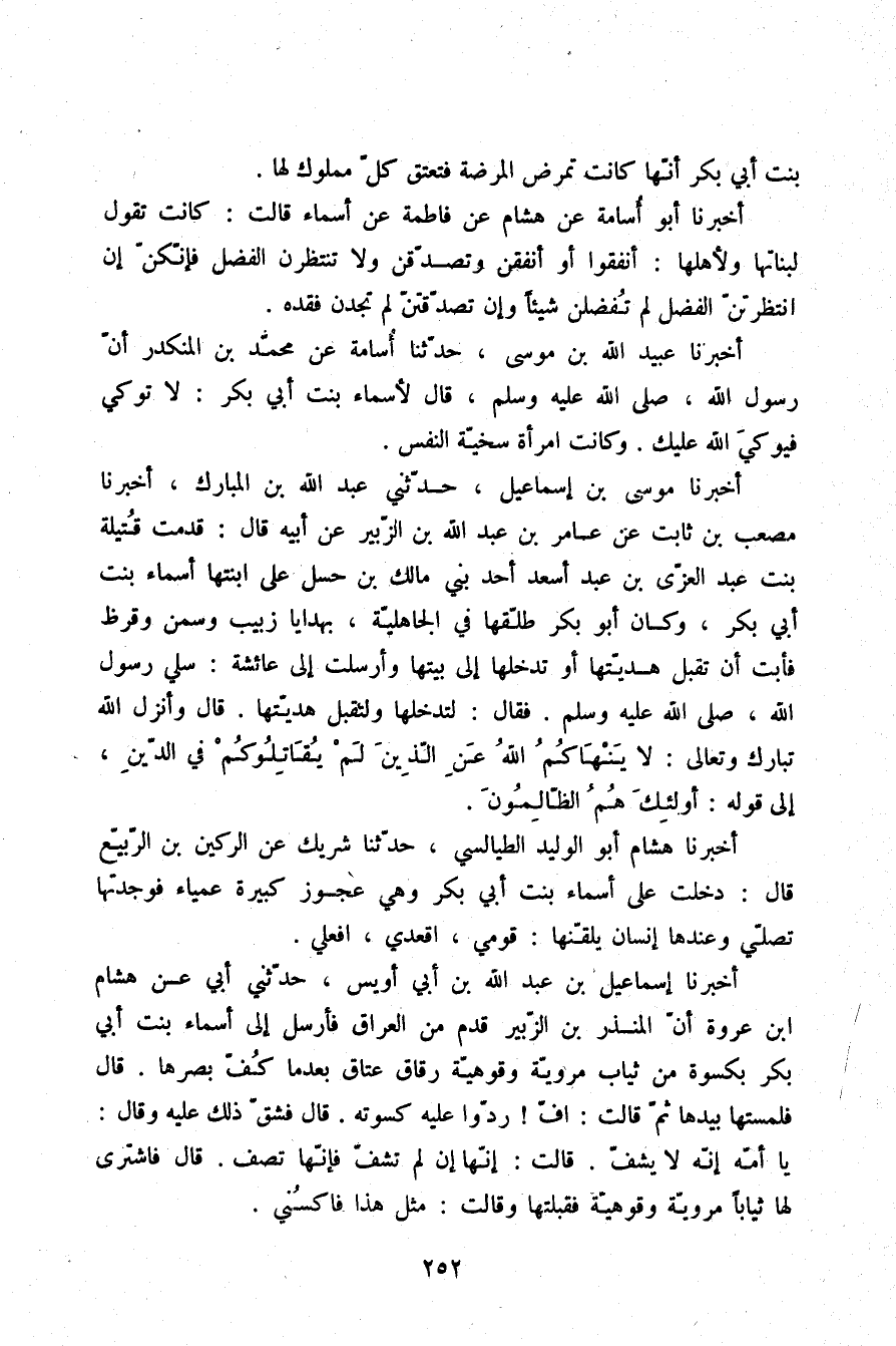 أَخْبَرَنَا مُوسَى بْنُ إِسْمَاعِيلَ، حَدَّثَنِي عَبْدُ اللَّهِ بْنُ الْمُبَارَكِ، أَخْبَرَنَا مُصْعَبُ بْنُ ثَابِتٍ، عَنْ عَامِرِ بْنِ عَبْدِ اللَّهِ بْنِ الزُّبَيْرِ، عَنْ أَبِيهِ قَالَ: قَدِمَتْ قُتَيْلَةُ بِنْتُ عَبْدِ الْعُزَّى بْنِ عَبْدِ أَسْعَدَ أَحَدِ بَنِي مَالِكِ بْنِ حَسَلٍ عَلَى ابْنَتِهَا أَسْمَاءَ بِنْتِ أَبِي بَكْرٍ , وَكَانَ أَبُو بَكْرٍ طَلَّقَهَا فِي الْجَاهِلِيَّةِ بِهَدَايَا زَبِيبٍ وَسَمْنٍ وَقَرَظٍ فَأَبَتْ أَنْ تَقْبَلَ هَدِيَّتَهَا أَوْ تُدْخِلَهَا إِلَى بَيْتِهَا وَأَرْسَلَتْ إِلَى عَائِشَةَ سَلِي رَسُولَ اللَّهِ صلّى الله عليه وسلم، فَقَالَ: «§لِتُدْخِلْهَا وَلْتَقْبَلْ هَدِيَّتَهَا» ، قَالَ: وَأَنْزَلَ اللَّهُ تَبَارَكَ وَتَعَالَى: {لَا يَنْهَاكُمُ اللَّهُ عَنِ الَّذِينَ لَمْ يُقَاتِلُوكُمْ فِي الدِّينِ} [الممتحنة: 8] إِلَى قَوْلِهِ: {أُولَئِكَ هُمُ الظَّالِمُونَ} [النور: 50] .