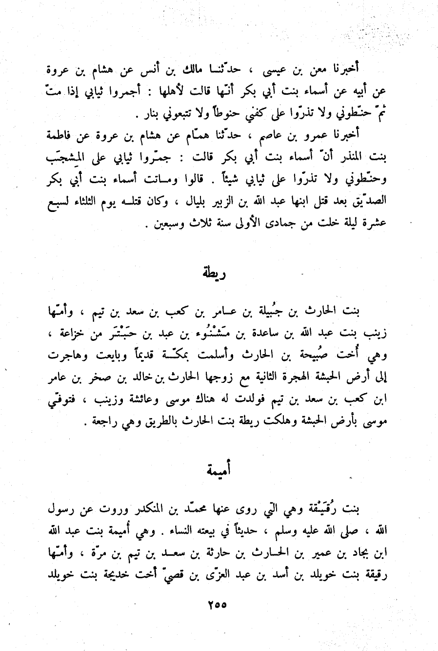 أَخْبَرَنَا عَمْرُو بْنُ عَاصِمٍ، حَدَّثَنَا هَمَّامٌ، عَنْ هِشَامِ بْنِ عُرْوَةَ، عَنْ فَاطِمَةَ بِنْتِ الْمُنْذِرِ، أَنَّ أَسْمَاءَ بِنْتَ أَبِي بَكْرٍ قَالَتْ: «§جَمِّرُوا ثِيَابِي عَلَى الْمِشْجَبِ وَحَنِّطُونِي وَلَا تَذَرُوا عَلَى ثِيَابِي شَيْئًا» قَالُوا: وَمَاتَتْ أَسْمَاءُ بِنْتُ أَبِي بَكْرٍ الصِّدِّيقِ بَعْدَ قَتْلِ ابْنِهَا عَبْدِ اللَّهِ بْنِ الزُّبَيْرِ بِلَيَالٍ وَكَانَ قَتْلُهُ يَوْمَ الثُّلَاثَاءِ لِسَبْعَ عَشْرَةَ لَيْلَةً خَلَتْ مِنْ جُمَادَى الْأُولَى سَنَةَ ثَلَاثٍ وَسَبْعِينَ.