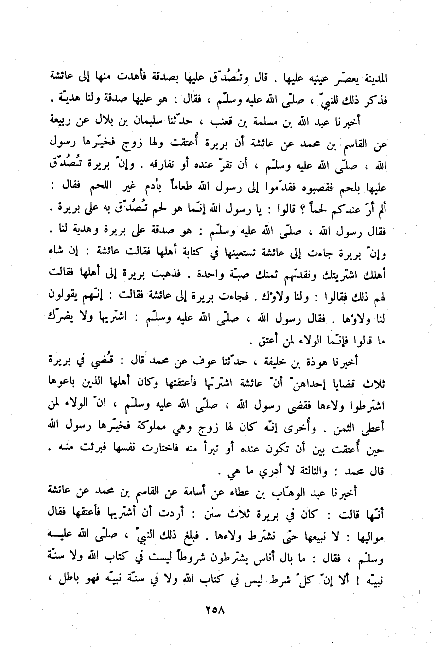 أَخْبَرَنَا عَبْدُ الْوَهَّابِ بْنُ عَطَاءٍ، عَنْ أُسَامَةَ، عَنِ الْقَاسِمِ بْنِ مُحَمَّدٍ، عَنْ عَائِشَةَ أَنَّهَا قَالَتْ: كَانَ فِي بَرِيرَةَ ثَلَاثُ سُنَنٍ أَرَدْتُ أَنْ أَشْتَرِيَهَا فَأُعْتِقَهَا، فَقَالَ مَوَالِيهَا: لَا نَبِيعُهَا حَتَّى نَشْتَرِطَ وَلَاءَهَا فَبَلَغَ ذَلِكَ النَّبِيَّ صلّى الله عليه وسلم، فَقَالَ: «§مَا بَالُ أُنَاسٍ يَشْتَرِطُونَ شُرُوطًا لَيْسَتْ فِي كِتَابِ اللَّهِ وَلَا فِي سُنَّةِ نَبِيِّهِ , أَلَا إِنَّ كُلَّ شَرْطٍ لَيْسَ فِي كِتَابِ اللَّهِ وَلَا فِي سُنَّةِ نَبِيِّهِ فَهُوَ بَاطِلٌ -[259]-. الْوَلَاءُ لِمَنْ أَعْتَقَ» ، قَالَ: فَلَمَّا أُعْتِقَتْ، قَالَ لَهَا رَسُولُ اللَّهِ صلّى الله عليه وسلم: «اخْتَارِي» ، قَالَ: وَكَانَ لَهَا زَوْجٌ، قَالَتْ: وَتُصُدِّقَ عَلَيْهَا بِصَدَقَةٍ فَأَهْدَتْ لَنَا مِنْهَا، فَقَالَ رَسُولُ اللَّهِ: «هُوَ لَهَا صَدَقَةٌ وَهُوَ لَنَا مِنْهَا هَدِيَّةٌ» .