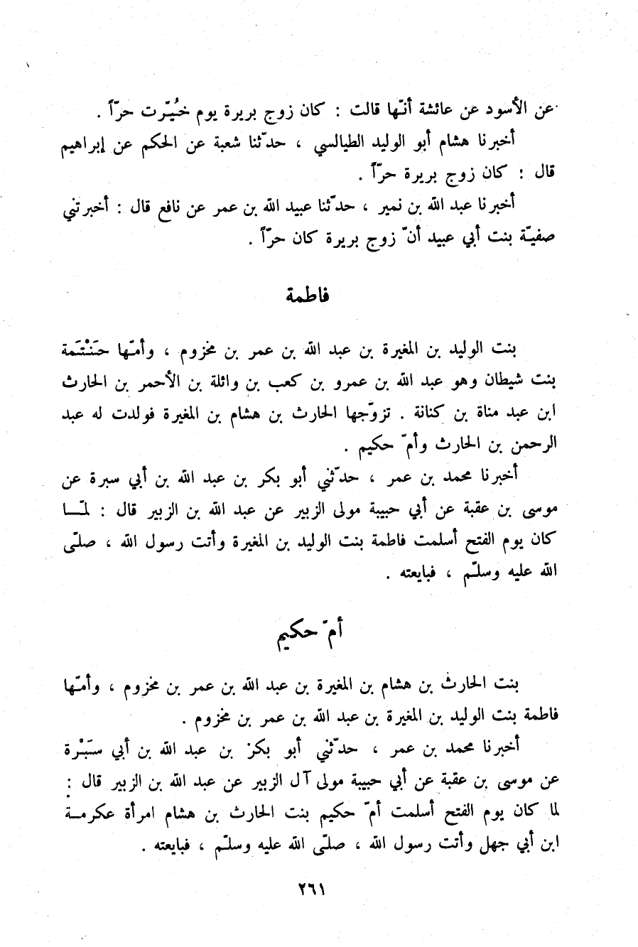 §أُمُّ حَكِيمِ بِنْتُ الْحَارِثِ بْنِ هِشَامِ بْنِ الْمُغِيرَةِ بْنِ عَبْدِ اللَّهِ بْنِ عُمَرَ بْنِ مَخْزُومٍ وَأُمُّهَا فَاطِمَةُ بِنْتُ الْوَلِيدِ بْنِ الْمُغِيرَةِ بْنِ عَبْدِ اللَّهِ بْنِ عُمَرَ بْنِ مَخْزُومٍ أَخْبَرَنَا مُحَمَّدُ بْنُ عُمَرَ، حَدَّثَنِي أَبُو بَكْرِ بْنُ عَبْدِ اللَّهِ بْنِ أَبِي سَبْرَةَ، عَنْ مُوسَى بْنِ عُقْبَةَ، عَنْ أَبِي حَبِيبَةَ، مَوْلَى آلِ الزُّبَيْرِ، عَنْ عَبْدِ اللَّهِ بْنِ الزُّبَيْرِ قَالَ: لَمَّا كَانَ يَوْمُ الْفَتْحِ أَسْلَمَتْ أُمُّ حَكِيمِ بِنْتُ الْحَارِثِ بْنِ هِشَامٍ امْرَأَةُ عِكْرِمَةَ بْنِ أَبِي جَهْلٍ وَأَتَتْ رَسُولَ اللَّهِ صلّى الله عليه وسلم فَبَايَعْتُهُ