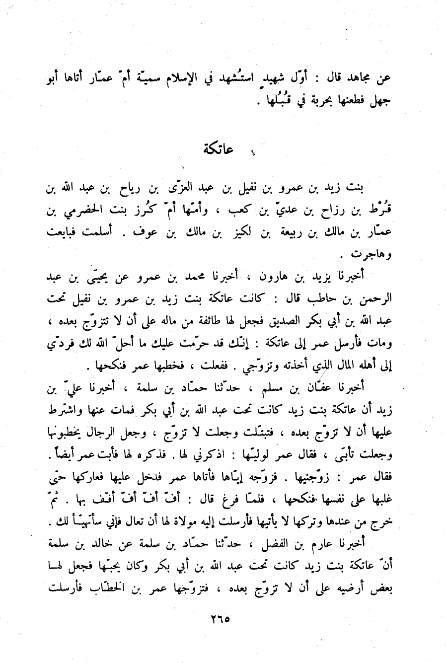 أَخْبَرَنَا عَارِمُ بْنُ الْفَضْلِ، حَدَّثَنَا حَمَّادُ بْنُ سَلَمَةَ، عَنْ خَالِدِ بْنِ سَلَمَةَ، أَنَّ عَاتِكَةَ بِنْتَ زَيْدٍ، كَانَتْ تَحْتَ عَبْدِ اللَّهِ بْنِ أَبِي بَكْرٍ وَكَانَ يُحِبُّهَا فَجَعَلَ لَهَا بَعْضَ أَرْضَيْهِ عَلَى أَنْ لَا تَزَوَّجَ بَعْدَهُ , فَتَزَوَّجَهَا عُمَرُ بْنُ الْخَطَّابِ، فَأَرْسَلَتْ -[266]- إِلَيْهَا عَائِشَةُ أَنْ §رُدِّي عَلَيْنَا أَرْضَنَا وَكَانَتْ عَاتِكَةُ قَدْ قَالَتْ حِينَ مَاتَ عَبْدُ اللَّهِ بْنُ أَبِي بَكْرٍ:
