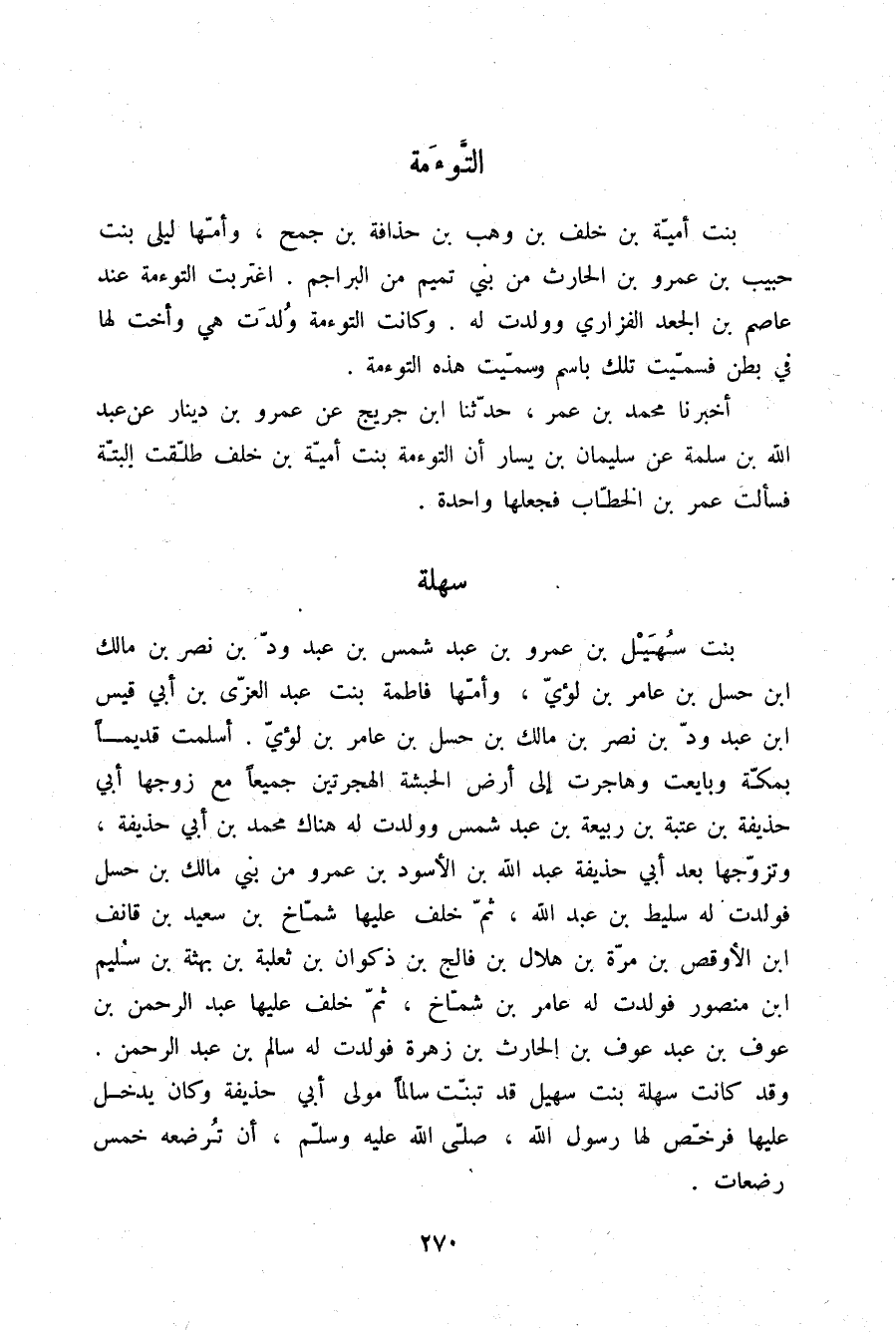§سَهْلَةُ بِنْتُ سُهَيْلِ بْنِ عَمْرِو بْنِ عَبْدِ شَمْسِ بْنِ عَبْدِ وُدِّ بْنِ نَصْرِ بْنِ مَالِكِ بْنِ حَسَلِ بْنِ عَامِرِ بْنِ لُؤَيٍّ وَأُمُّهَا فَاطِمَةُ بِنْتُ عَبْدِ الْعُزَّى بْنِ أَبِي قَيْسِ بْنِ عَبْدِ وُدِّ بْنِ نَصْرِ بْنِ مَالِكِ بْنِ حَسَلِ بْنِ عَامِرِ بْنِ لُؤَيٍّ. أَسْلَمَتْ قَدِيمًا بِمَكَّةَ وَبَايَعَتْ وَهَاجَرَتْ إِلَى أَرْضِ الْحَبَشَةِ الْهِجْرَتَيْنِ جَمِيعًا مَعَ زَوْجِهَا أَبِي حُذَيْفَةَ بْنِ عُتْبَةَ بْنِ رَبِيعَةَ بْنِ عَبْدِ شَمْسٍ وَوَلَدَتْ لَهُ هُنَاكَ مُحَمَّدَ بْنَ أَبِي حُذَيْفَةَ وَتَزَوَّجَهَا بَعْدَ أَبِي حُذَيْفَةَ عَبْدُ اللَّهِ بْنُ الْأَسْوَدِ بْنِ عَمْرٍو مِنْ بَنِي مَالِكِ بْنِ حَسَلٍ فَوَلَدَتْ لَهُ سَلِيطَ بْنَ عَبْدِ اللَّهِ ثُمَّ خَلَفَ عَلَيْهَا شَمَّاخُ بْنُ سَعِيدِ بْنِ قَائِفِ بْنِ الْأَوْقَصِ بْنِ مُرَّةَ بْنِ هِلَالِ بْنِ فَالِجِ بْنِ ذَكْوَانَ بْنِ ثَعْلَبَةَ بْنِ بُهْثَةَ بْنِ سُلَيْمِ بْنِ مَنْصُورٍ، فَوَلَدَتْ لَهُ عَامِرَ بْنَ شَمَّاخٍ ثُمَّ خَلَفَ عَلَيْهَا عَبْدُ الرَّحْمَنِ بْنُ عَوْفِ بْنِ عَبْدِ عَوْفِ بْنِ الْحَارِثِ بْنِ زُهْرَةَ فَوَلَدَتْ لَهُ سَالِمَ بْنَ عَبْدِ الرَّحْمَنِ، وَقَدْ كَانَتْ سَهْلَةُ بِنْتُ سُهَيْلٍ قَدْ تَبَنَّتْ سَالِمًا مَوْلَى أَبِي حُذَيْفَةَ وَكَانَ يَدْخُلُ عَلَيْهَا فَرَخَّصَ لَهَا رَسُولُ اللَّهِ صلّى الله عليه وسلم أَنْ تُرْضِعَهُ خَمْسَ رَضَعَاتٍ.