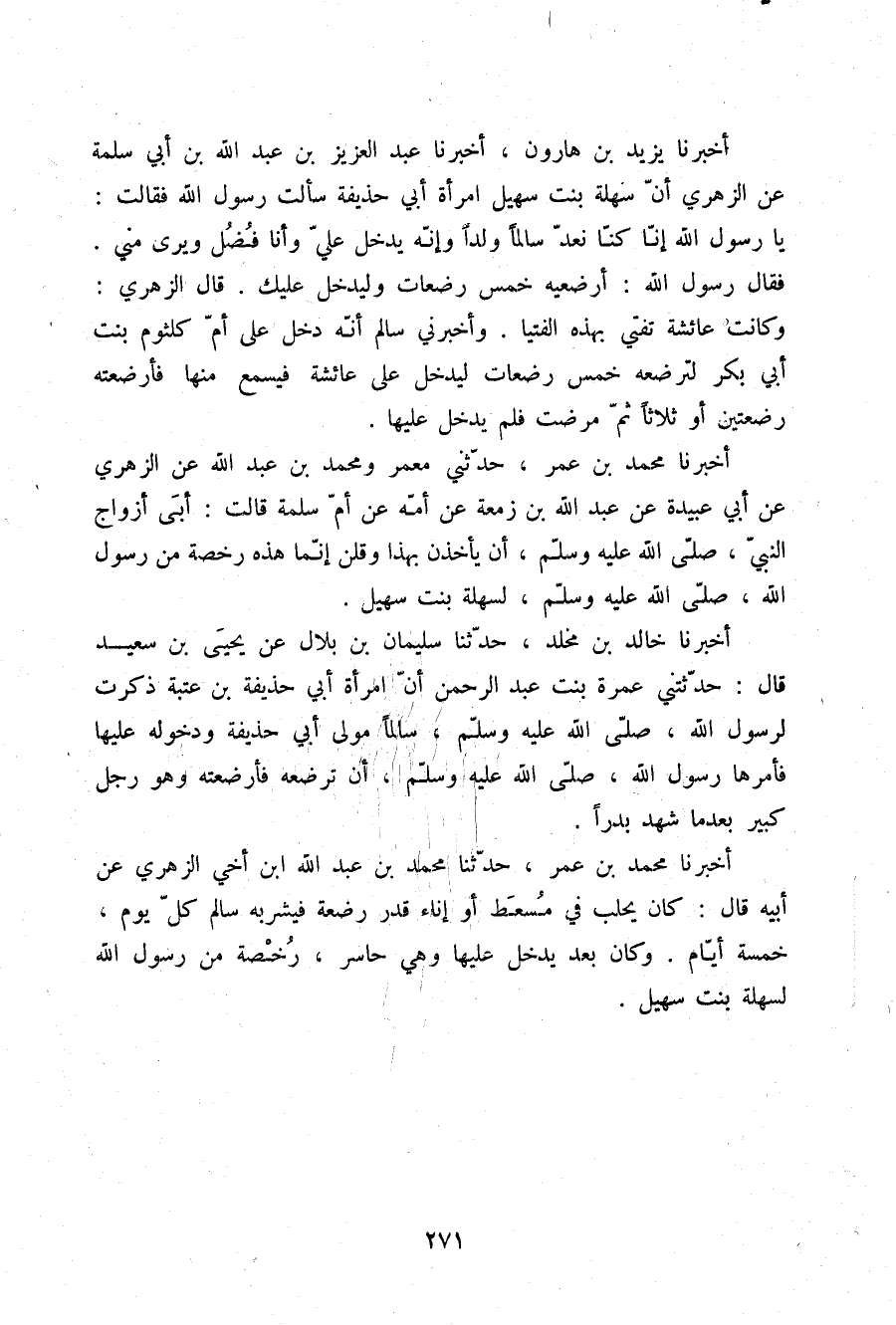 أَخْبَرَنَا خَالِدُ بْنُ مَخْلَدٍ، حَدَّثَنَا سُلَيْمَانُ بْنُ بِلَالٍ، عَنْ يَحْيَى بْنِ سَعِيدٍ قَالَ: حَدَّثَتْنِي عَمْرَةُ بِنْتُ عَبْدِ الرَّحْمَنِ، §أَنَّ امْرَأَةَ أَبِي حُذَيْفَةَ بْنِ عُتْبَةَ ذَكَرَتْ لِرَسُولِ اللَّهِ صلّى الله عليه وسلم سَالِمًا مَوْلَى أَبِي حُذَيْفَةَ وَدُخُولَهُ عَلَيْهَا فَأَمَرَهَا رَسُولُ اللَّهِ صلّى الله عليه وسلم أَنْ تُرْضِعَهُ فَأَرْضَعَتْهُ وَهُوَ رَجُلٌ كَبِيرٌ بَعْدَمَا شَهِدَ بَدْرًا. أَخْبَرَنَا مُحَمَّدُ بْنُ عُمَرَ، حَدَّثَنَا مُحَمَّدُ بْنُ عَبْدِ اللَّهِ ابْنُ أَخِي الزُّهْرِيِّ، عَنْ أَبِيهِ قَالَ: كَانَ يَحْلُبُ فِي مِسْعَطٍ أَوْ إِنَاءٍ قَدْرَ رَضْعَةٍ فَيَشْرَبُهُ سَالِمٌ كُلَّ يَوْمٍ خَمْسَةَ أَيَّامٍ وَكَانَ بَعْدُ يَدْخُلُ عَلَيْهَا وَهِيَ حَاسِرٌ رُخْصَةً مِنْ رَسُولِ اللَّهِ لِسَهْلَةَ بِنْتِ سُهَيْلٍ
