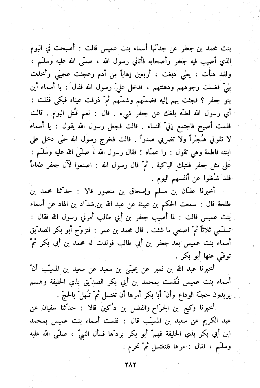 أَخْبَرَنَا عَفَّانُ بْنُ مُسْلِمٍ، وَإِسْحَاقُ بْنُ مَنْصُورٍ، قَالَا: حَدَّثَنَا مُحَمَّدُ بْنُ طَلْحَةَ، قَالَ: سَمِعْتُ الْحَكَمَ بْنَ عُيَيْنَةَ، عَنْ عَبْدِ اللَّهِ بْنِ شَدَّادِ بْنِ الْهَادِ، عَنْ أَسْمَاءَ بِنْتِ عُمَيْسٍ قَالَتْ: لَمَّا أُصِيبَ جَعْفَرُ بْنُ أَبِي طَالِبٍ أَمَرَنِي رَسُولُ اللَّهِ، فَقَالَ: «§تَسَلَّمِي ثَلَاثًا ثُمَّ اصْنَعِي مَا شِئْتِ» . قَالَ مُحَمَّدُ بْنُ عُمَرَ: فَتَزَوَّجَ أَبُو بَكْرٍ الصِّدِّيقُ أَسْمَاءَ بِنْتَ عُمَيْسٍ بَعْدَ جَعْفَرِ بْنِ أَبِي طَالِبٍ فَوَلَدَتْ لَهُ مُحَمَّدَ بْنَ أَبِي بَكْرٍ ثُمَّ تُوُفِّيَ عَنْهَا أَبُو بَكْرٍ
