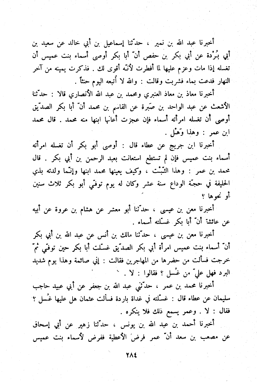 أَخْبَرَنَا عَبْدُ اللَّهِ بْنُ نُمَيْرٍ، حَدَّثَنَا إِسْمَاعِيلُ بْنُ أَبِي خَالِدٍ، عَنْ سَعِيدِ بْنِ أَبِي بُرْدَةَ، عَنْ أَبِي بَكْرِ بْنِ حَفْصٍ، §أَنَّ أَبَا بَكْرٍ أَوْصَى أَسْمَاءَ بِنْتَ عُمَيْسٍ أَنْ تُغَسِّلَهُ إِذَا مَاتَ وَعَزَّمَ عَلَيْهَا لَمَا أَفْطَرَتْ لِأَنَّهُ أَقْوَى لَكِ، فَذَكَرَتْ يَمِينَهُ مِنْ آخِرِ النَّهَارِ فَدَعَتْ بِمَاءٍ فَشَرِبَتْ وَقَالَتْ: وَاللَّهِ لَا أُتْبِعُهُ الْيَوْمَ حِنْثًا.