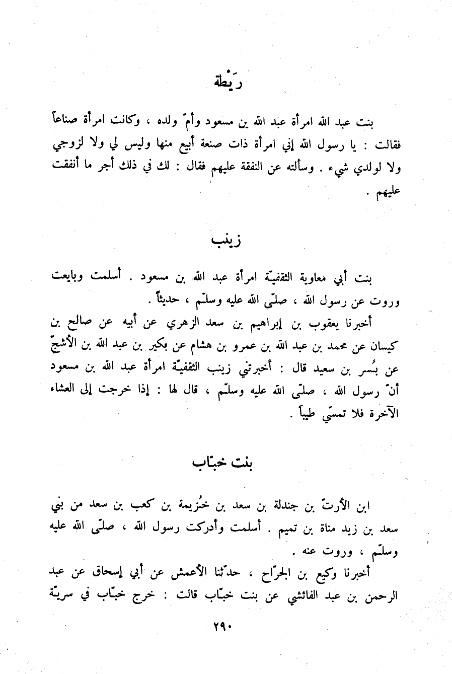 §رَيْطَةُ بِنْتُ عَبْدِ اللَّهِ امْرَأَةُ عَبْدِ اللَّهِ بْنِ مَسْعُودٍ وَأُمُّ وَلَدِهِ وَكَانَتِ امْرَأَةً صَنَاعًا فَقَالَتْ: يَا رَسُولَ اللَّهِ إِنِّي امْرَأَةٌ ذَاتُ صَنْعَةٍ أَبِيعُ مِنْهَا وَلَيْسَ لِي وَلَا لِزَوْجِي وَلَا لِوَلَدِي شَيْءٌ. وَسَأَلْتُهُ عَنِ النَّفَقَةِ عَلَيْهِمْ، فَقَالَ: «لَكِ فِي ذَلِكَ أَجْرٌ مَا أَنْفَقْتِ عَلَيْهِمْ» .