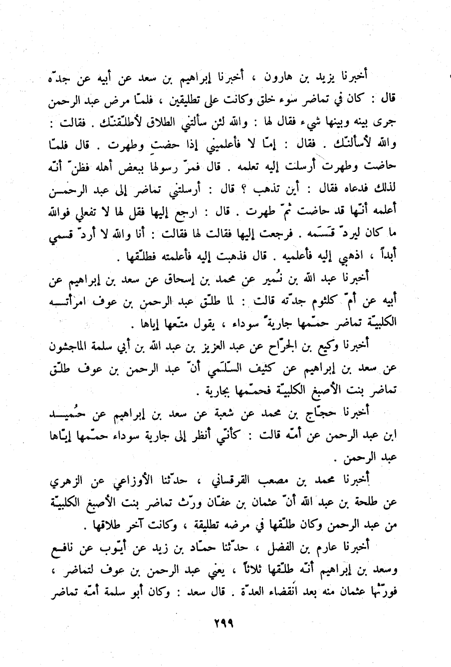 أَخْبَرَنَا عَارِمُ بْنُ الْفَضْلِ، حَدَّثَنَا حَمَّادُ بْنُ زَيْدٍ، عَنْ أَيُّوبَ، عَنْ نَافِعٍ، وَسَعْدِ بْنِ إِبْرَاهِيمَ، أَنَّهُ طَلَّقَهَا ثَلَاثًا يَعْنِي عَبْدَ الرَّحْمَنِ بْنَ عَوْفٍ لِتُمَاضِرَ §فَوَرَّثَهَا عُثْمَانُ مِنْهُ بَعْدَ انْقِضَاءِ الْعِدَّةِ. قَالَ سَعْدٌ: وَكَانَ أَبُو سَلَمَةَ أُمُّهُ تُمَاضِرُ -[300]- بِنْتُ الْأَصْبَغِ. قَالَ مُحَمَّدُ بْنُ عُمَرَ: ثُمَّ تَزَوَّجَ الزُّبَيْرُ بْنُ الْعَوَّامِ بْنِ خُوَيْلِدٍ تُمَاضِرَ بِنْتَ الْأَصْبَغِ الْكَلْبِيَّةَ بَعْدَ عَبْدِ الرَّحْمَنِ بْنِ عَوْفٍ فَلَمْ تَلْبَثْ عِنْدَهُ إِلَّا يَسِيرًا حَتَّى طَلَّقَهَا