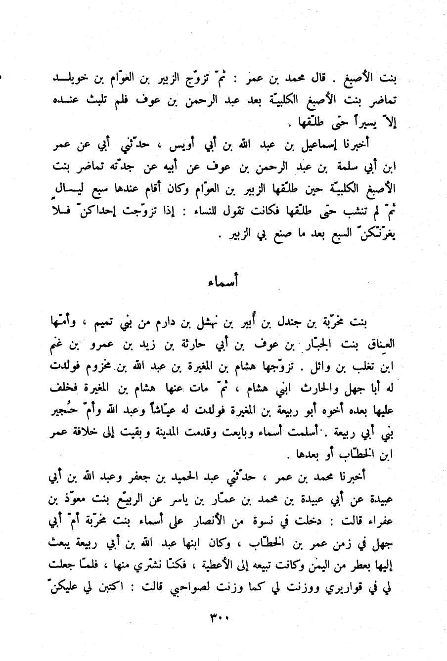 أَخْبَرَنَا مُحَمَّدُ بْنُ عُمَرَ، حَدَّثَنِي عَبْدُ الْحَمِيدِ بْنُ جَعْفَرٍ، وَعَبْدُ اللَّهِ بْنُ أَبِي عُبَيْدَةَ، عَنْ أَبِي عُبَيْدَةَ بْنِ مُحَمَّدِ بْنِ عَمَّارِ بْنِ يَاسِرٍ، عَنِ الرُّبَيِّعِ بِنْتِ مُعَوِّذِ بْنِ عَفْرَاءَ قَالَتْ: دَخَلْتُ فِي نِسْوَةٍ مِنْ الْأَنْصَارِ عَلَى أَسْمَاءَ بِنْتِ مُخَرَّبَةَ أُمِّ أَبِي جَهْلٍ فِي زَمَنِ عُمَرَ بْنِ الْخَطَّابِ وَكَانَ ابْنُهَا عَبْدُ اللَّهِ بْنُ أَبِي رَبِيعَةَ يَبْعَثُ إِلَيْهَا بِعِطْرٍ مِنْ الْيَمَنِ وَكَانَتْ تَبِيعُهُ إِلَى الْأَعْطِيَةِ فَكُنَّا نَشْتَرِي مِنْهَا، فَلَمَّا جَعَلَتْ لِي فِي قَوَارِيرِي وَوَزَنَتْ لِي كَمَا وَزَنَتْ لِصَوَاحِبِي، قَالَتْ: §اكْتُبْنَ لِي عَلَيْكُنَّ -[301]- حَقِّي فَقُلْتُ نَعَمْ: أَكْتُبُ لَهَا عَلَى الرُّبَيِّعِ بِنْتِ مُعَوِّذٍ، فَقَالَتْ أَسْمَاءُ: حَلْقَى وَإِنَّكِ لَابْنَةُ قَاتِلِ سَيِّدِهِ، قَالَتْ: قُلْتُ لَا وَلَكِنَّ ابْنَةُ قَاتُلِ عَبْدِهِ، قَالَتْ: وَاللَّهِ لَا أَبِيعُكِ شَيْئًا أَبَدًا، فَقُلْتُ: وَأَنَا وَاللَّهِ لَا أَشْتَرِي مِنْكِ شَيْئًا أَبَدًا فَوَاللَّهِ مَا هُوَ بِطِيبٍ وَلَا عَرَفٍ وَوَاللَّهِ يَا بُنَيَّ مَا شَمِمْتُ عِطْرًا قَطُّ كَانَ أَطْيَبَ مِنْهُ وَلَكِنِّي غَضِبْتُ ".